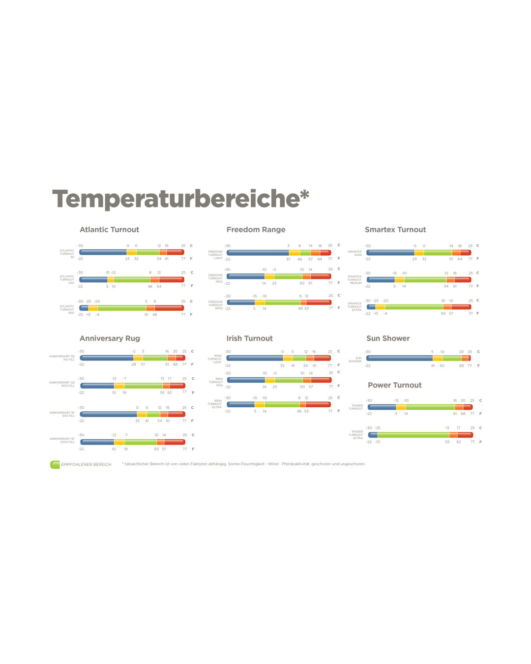 Du möchtest die Decke erweitern? Kein Problem: Die Irish Turnout ist kompatibel mit allen Bucas Quilts und Coolers. Der optimale Temperaturbereich für diese Decke liegt laut Bucas bei etwa 5 °C bis +12 °C. Dieser ungefähre Richtwert ist eine Empfehlung, die von Faktoren wie Sonne, Luftfeuchtigkeit, Wind und Aktivität deines Pferdes beeinflusst werden kann.