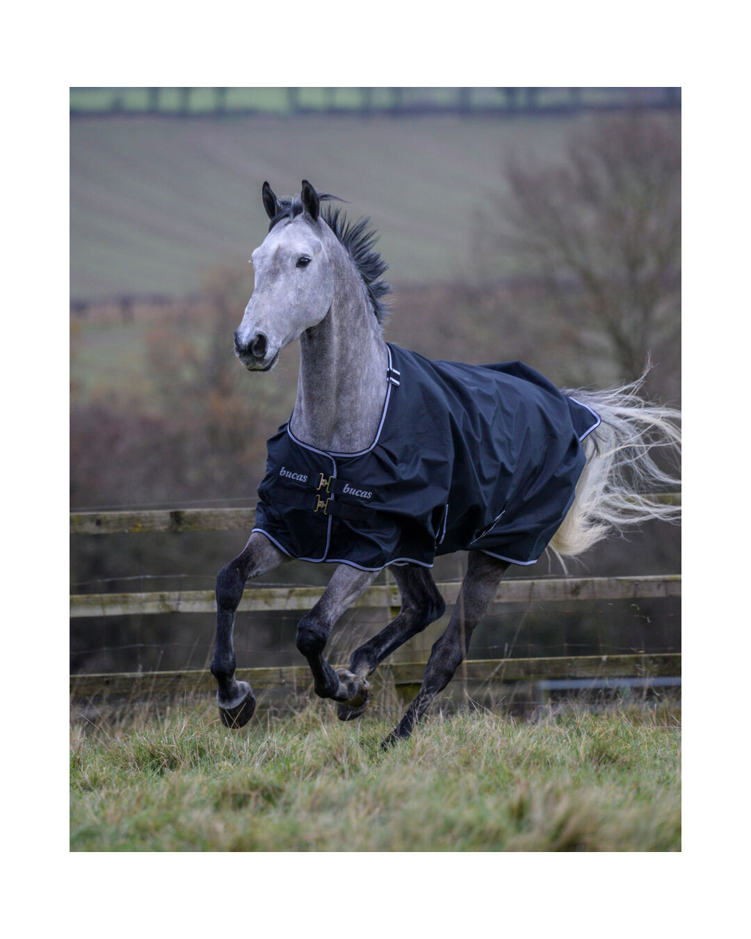 Die Bucas Trot Turnout Decke ist nämlich speziell auf die Form eines Traberpferdes konzipiert. Sie ist wasserdicht und atmungsaktiv, mit einem Ripstop Außenmaterial und einem seidenweichen Innenfutter. Zur Ausstattung gehören die Bucas-typischen Schulterfalten, der doppelte Brustverschluss mit T-Schnalle sowie der Magnetic-Snap-lock Verschluss für eine optimale Passform. Diese Decke ist mit 50 g Isolierung erhältlich und hat Befestigungspunkte für ein optional zu erwerbendes Halsteil.