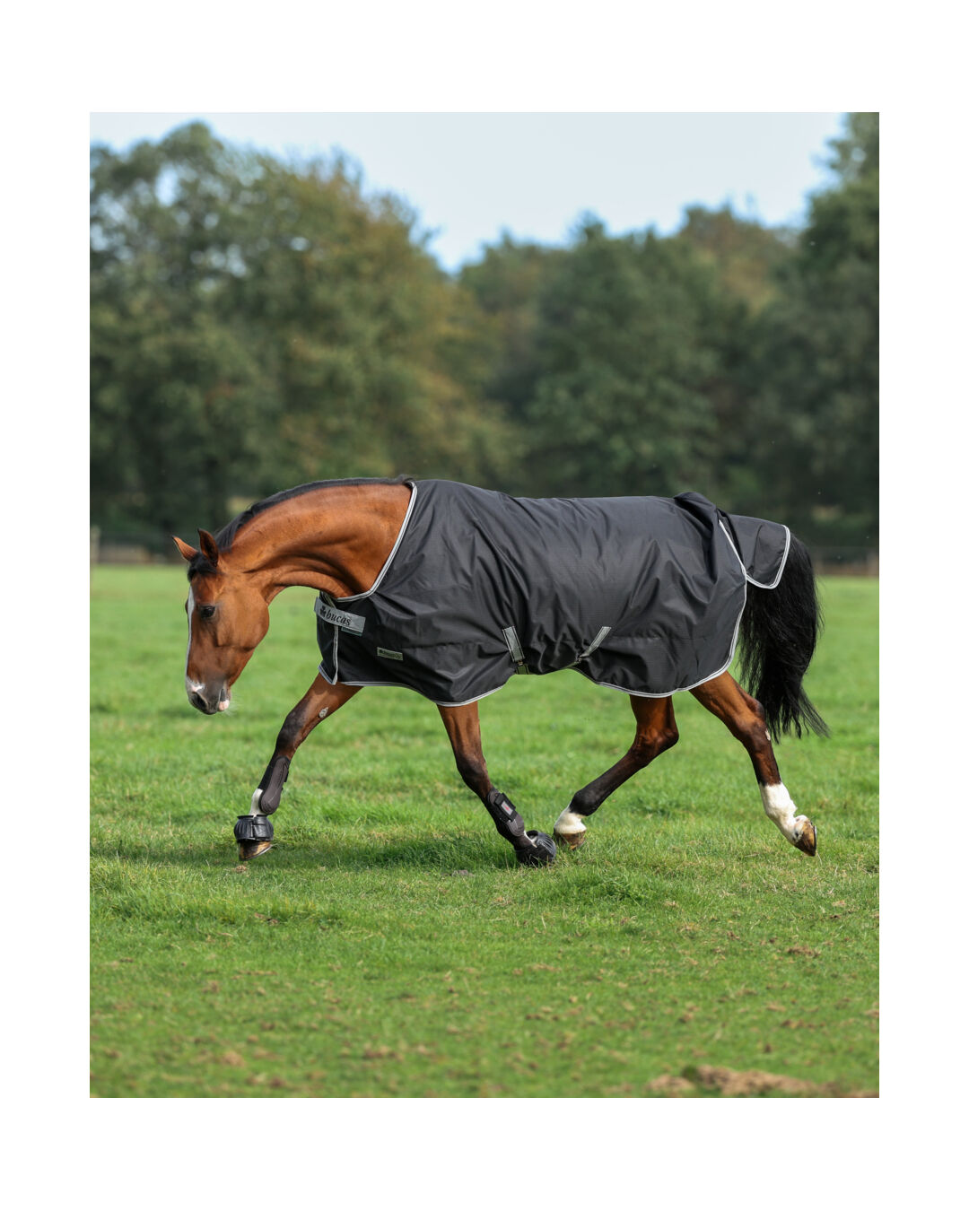 Dank der wasserdichten und atmungsaktiven Eigenschaften bleibt dein Pferd bei jedem Wetter trocken und komfortabel. Die Decke ist mit einem T-Bar-Verschluss mit Magnet-Snap-Lock ausgestattet, der für einfaches Anlegen sorgt. Die Schulterfalte ermöglicht eine optimale Bewegungsfreiheit, während Kreuzgurte und Beinschnallen für sicheren Halt sorgen. Der großzügige Schweiflatz bietet zusätzlichen Schutz.