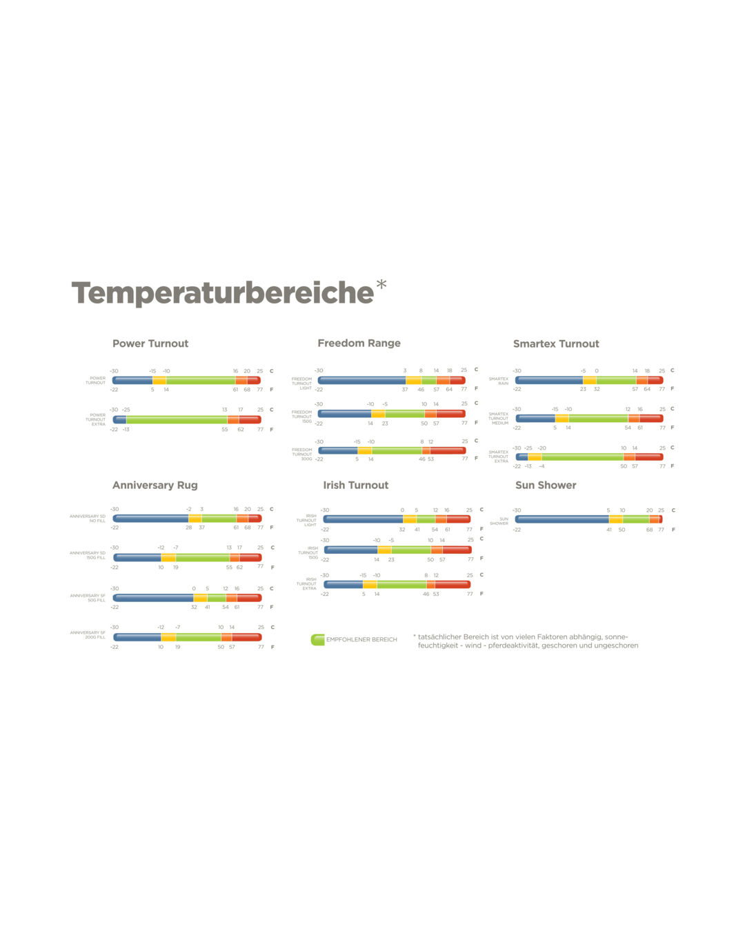 Einen perfekten Komfort und Schutz gewährleistet die Decke sowohl bei niedrigen als auch bei höheren Temperaturen. Der optimale Bereich für diese Decke liegt laut Bucas bei etwa -10 °C bis +16 °C. Dieser ungefähre Richtwert ist eine Empfehlung, die von Faktoren wie Sonne, Luftfeuchtigkeit, Wind und Aktivität deines Pferdes beeinflusst werden kann.