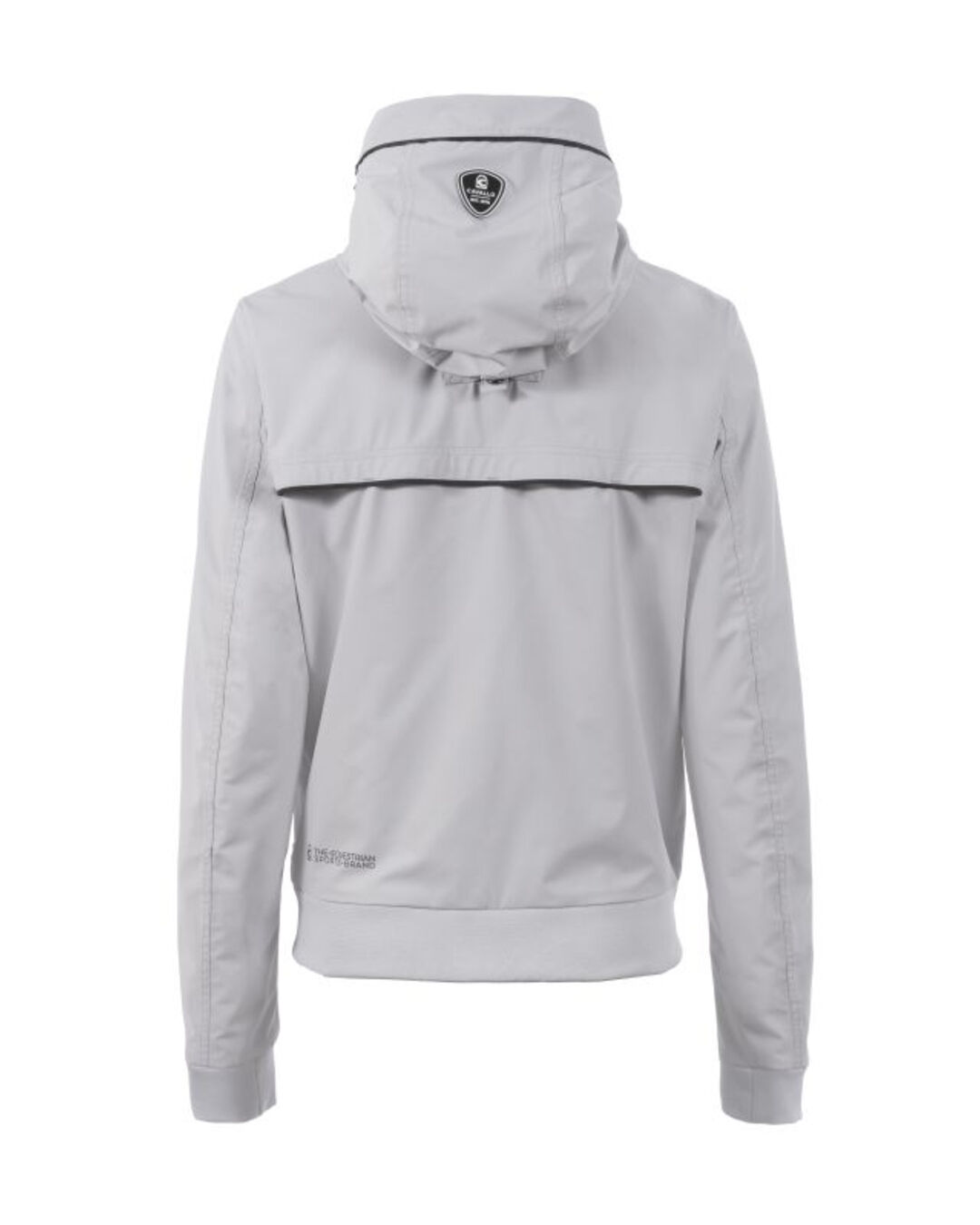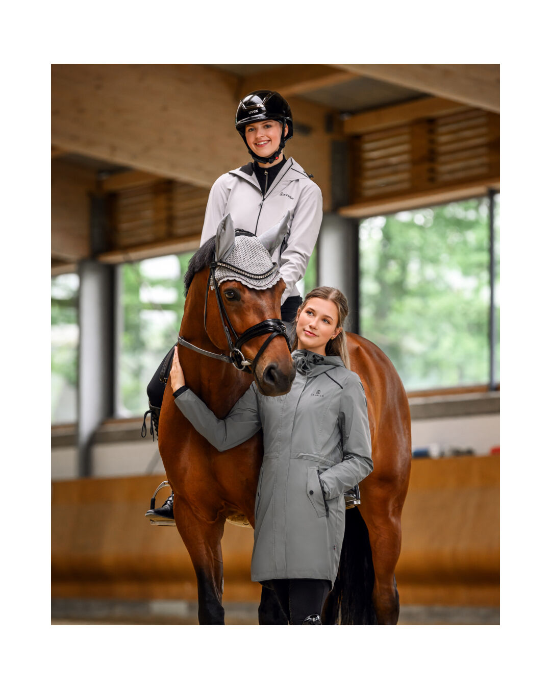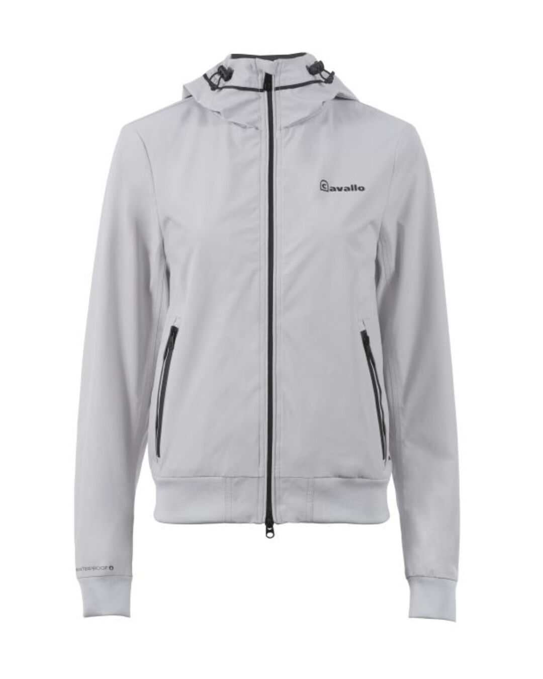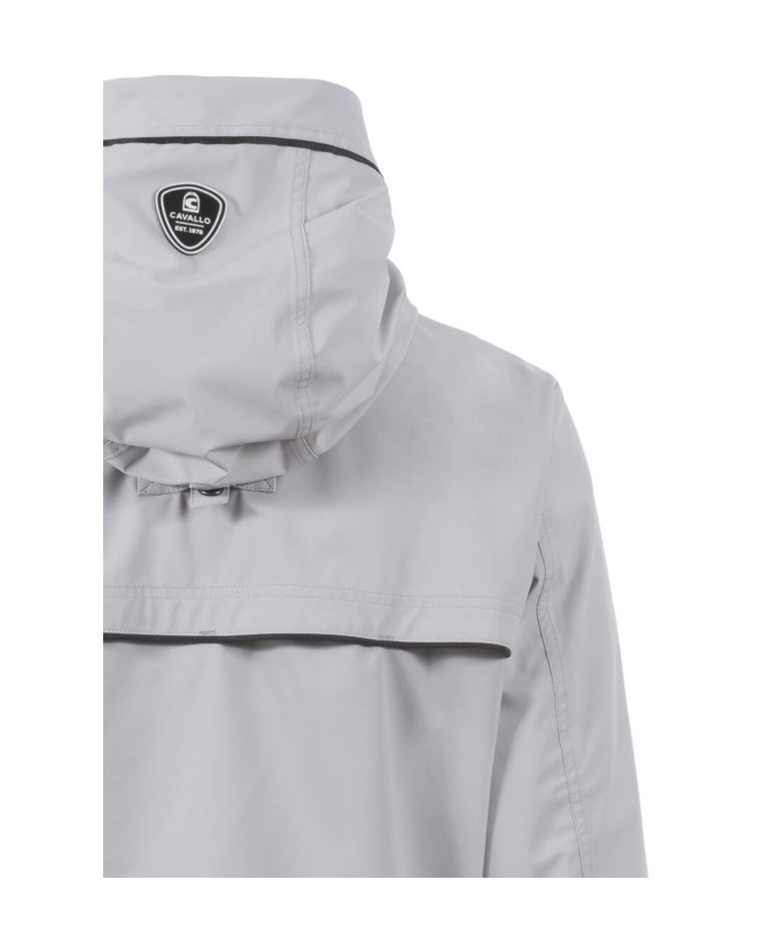 Die angeschnittene Kapuze lässt sich mit einem Cavallo-Druckknopf am Rücken fixieren und verfügt über eine schmale, schwarze Ripspaspel. Ein individuell verstellbarer Tunnelzug ermöglicht eine flexible Anpassung. Der schwarze, wasserdichte 2-Wege-Frontreißverschluss sorgt für Schutz vor Nässe, während die Eingriffstaschen mit Druckknopf und wasserdichte Reißverschlusstaschen mit Cavallo-Anhänger praktischen Stauraum bieten.