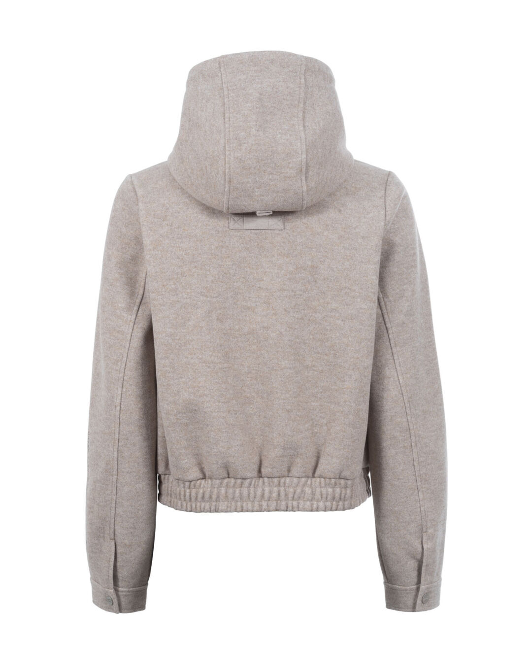 Die hochwertige Außenware in Wolloptik verleiht der Jacke eine elegante, warme Ausstrahlung, während die Kapuze mit tonigem Kordelzug und praktischem Druckknopf am Rücken fixierbar ist. So bleibt sie auch bei Bewegung sicher in Position.