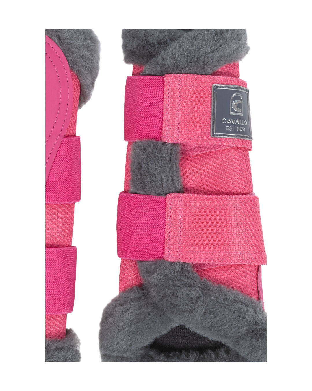 Das atmungsaktive Mesh auf der Innenseite sorgt für eine gute Luftzirkulation und beugt Hitzestau vor, während die Fake-Fur-Einfassung weich am Pferdebein anliegt und Scheuerstellen vermeidet. Außen schützt robustes Kunstleder vor Schlägen, Kratzern und anderen Belastungen. Zwei bis drei breite Gummibänder mit Flausch-Klettverschluss bieten sicheren Halt – schnell und einfach anzubringen. Ein besonderes Detail: Das oberste Klettband ist mit einem hochwertigen Cavallo-Label veredelt.