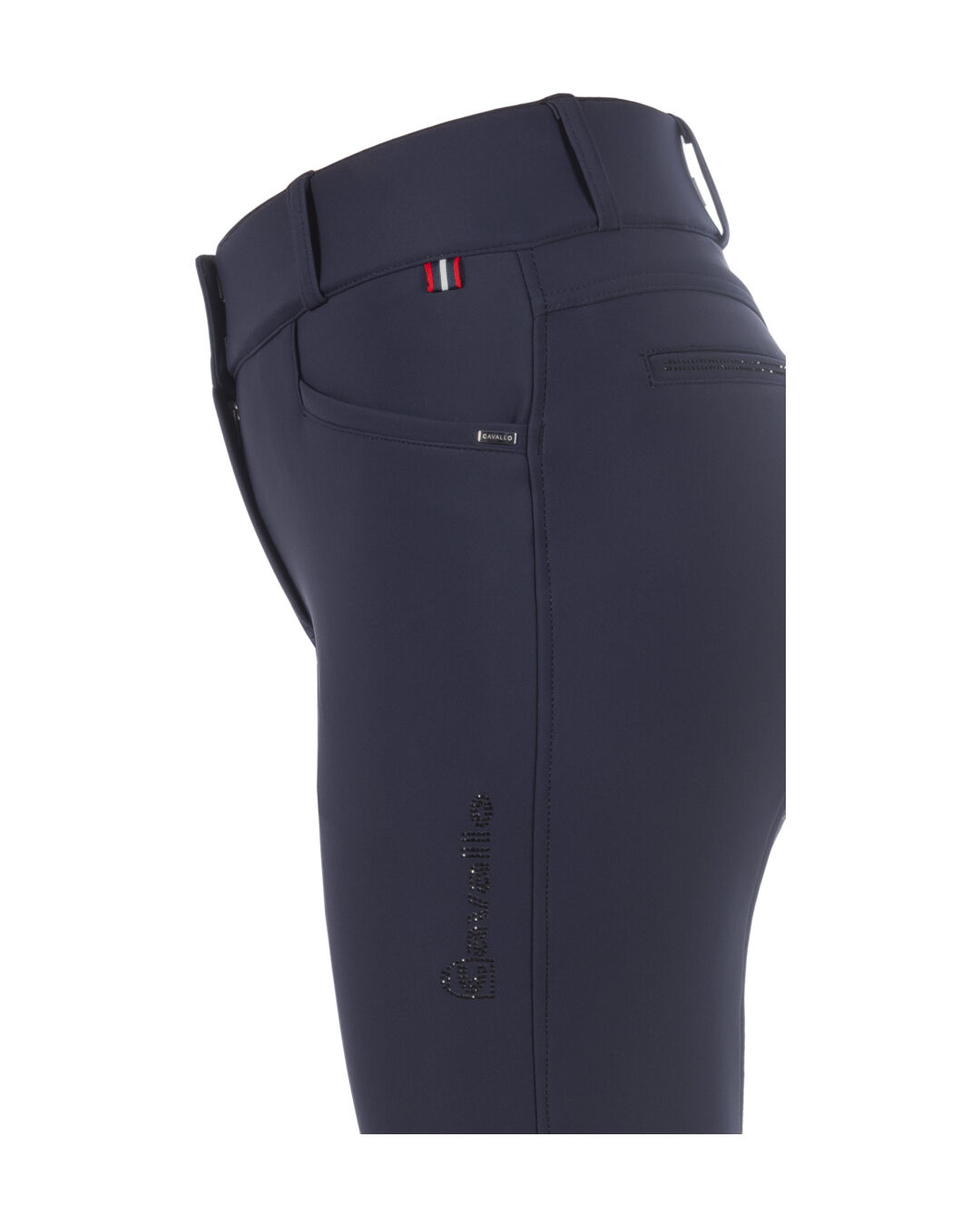 Ein echtes Highlight: das glitzernde Cavallo-Logo aus Kristallen am linken Oberschenkel – edel, aber nicht too much. Für einen einheitlichen Look sind die Taschenbeutel immer schwarz mit einem kontrastierenden Cavallo-Logo bedruckt. Und auch wichtig: Die Hose ist vorwiegend blickdicht.