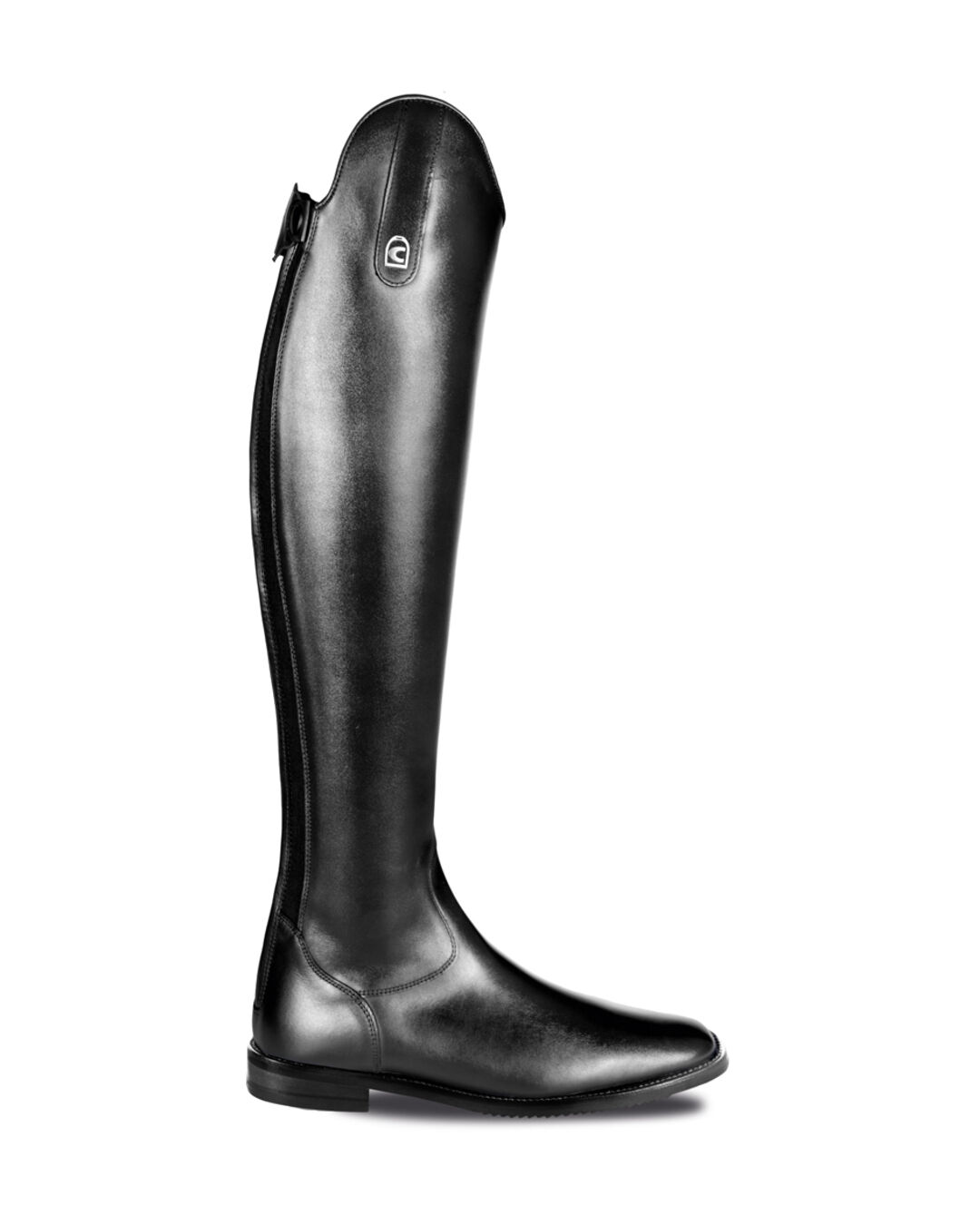 Ein besonderes Highlight ist der bis zum Ansatz verdeckte Reißverschluss, der nicht nur einen leichten Einstieg ermöglicht, sondern auch für eine nahtlose und stilvolle Optik sorgt. Der Querelasteinsatz bis zur Hinterkappe bietet zusätzliche Flexibilität und eine optimale Passform. Der praktische Peitschenhalter (die Lasche am oberen Ende) und die Außenversteifung runden das durchdachte Design ab und machen diesen Stiefel zu einem Must-have für jeden ambitionierten Dressurreiter.