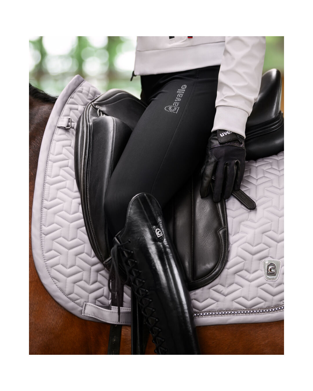 Die Kristallverzierung verleiht der Schabracke einen luxuriösen Touch und macht sie zu einem echten Hingucker. Die Cavallo Logo Patches in Gunmetal Optik an den hinteren Ecken unterstreichen den hochwertigen Look. Darüber hinaus sorgt das Cool Comfort Mesh-Futter für eine schnelle Trocknung und Feuchtigkeitstransport, während es gleichzeitig hautfreundlich, kühlend und langlebig ist.