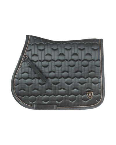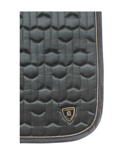 Das glänzende Obermaterial verleiht der Schabracke einen eleganten Look. Ein goldfarbenes Band mit schwarzem Kontrast entlang der Einfassung und hochwertige Cavallo-Logo-Patches in Goldoptik an den hinteren Ecken runden das Design ab.