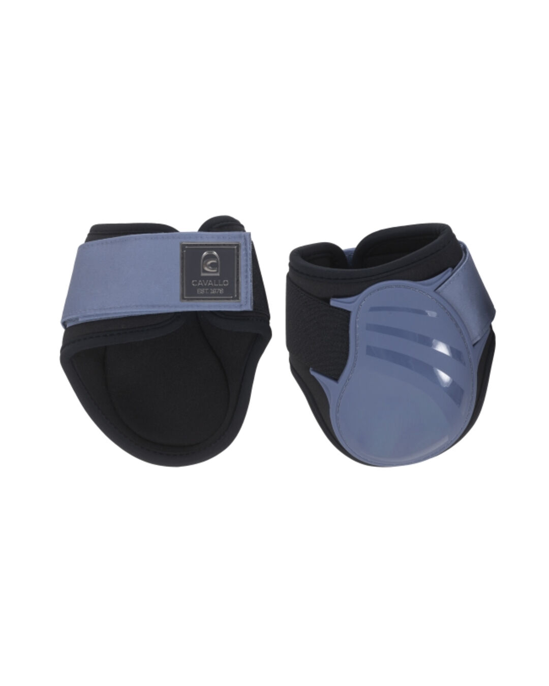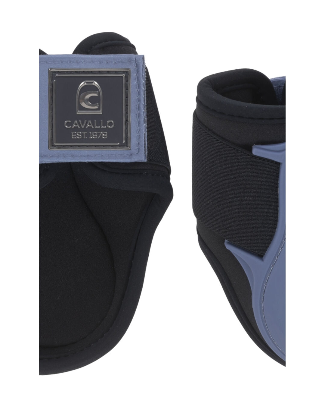 Die Innenseite der Streichkappen ist mit angenehmem Neopren gefüttert, um Reibung und Scheuerstellen zu vermeiden. Die Streichkappen werden mit einem breiten Gummiband und Flauschband verschlossen, das mit einem vertikalen Klettband fixiert wird. Auf der Oberseite des Klettbandes ist ein großes, silbernes Cavallo-Logo aufgedruckt.