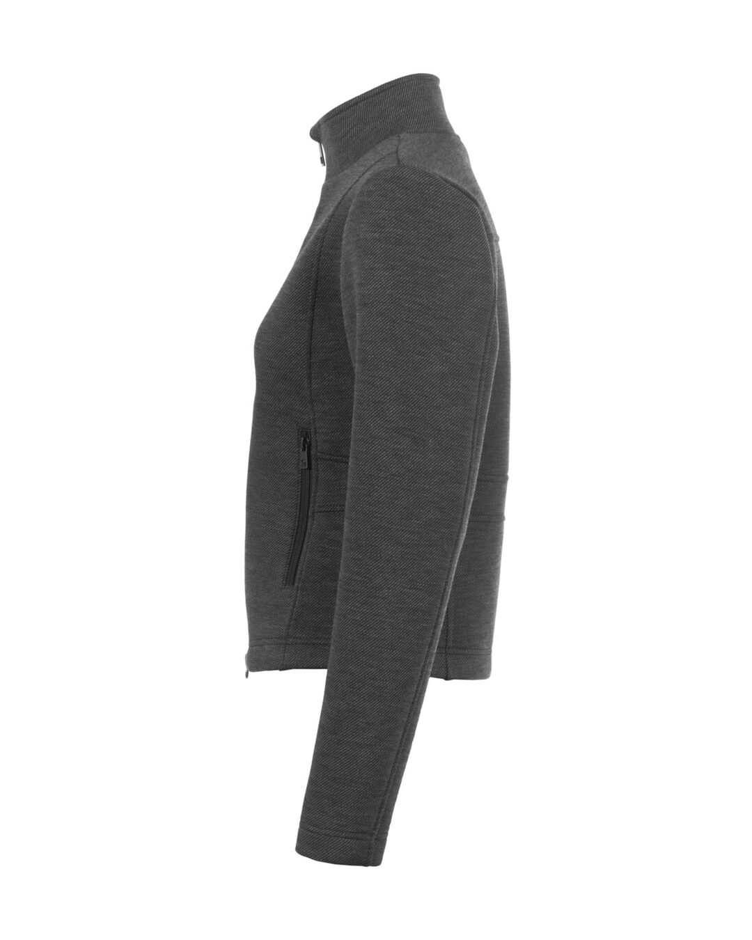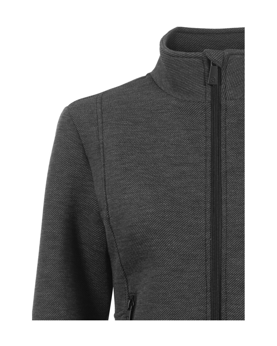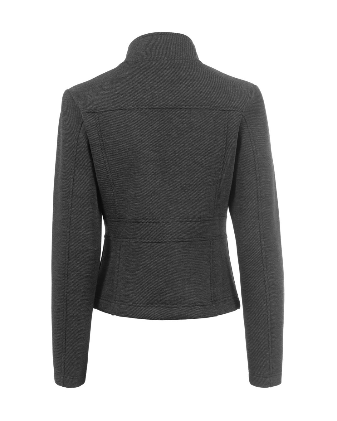 Der kurze Schnitt mit schmeichelnder Nahtführung sorgt für eine moderne Silhouette, während die Außenware mit zartem, diagonalem Streifen dem Look eine exklusive Note verleiht. Der praktische Stehkragen bietet Schutz an kühleren Tagen und unterstreicht den cleanen Stil.