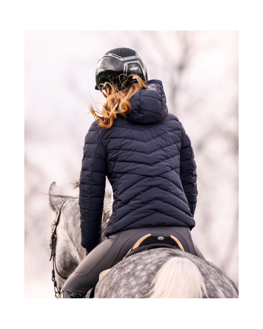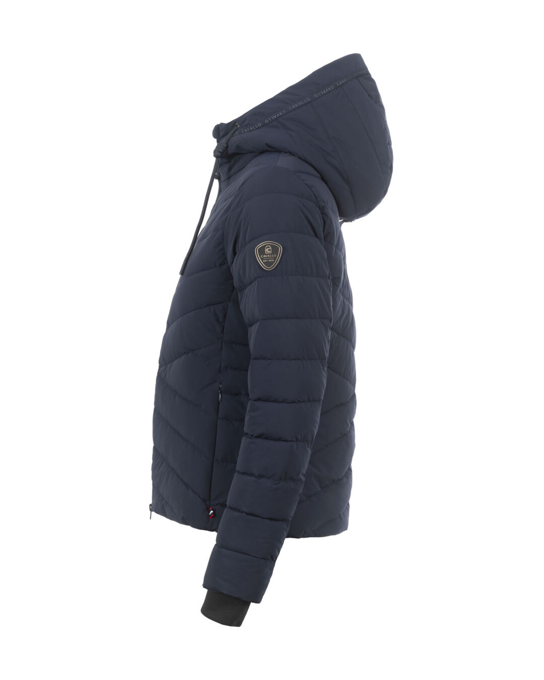 Die Kapuze ist mit tonigen Kordelzügen und raffinierten Details versehen und kann mit einem Druckknopf am Rücken fixiert werden. Elastische Rippbündchen an den Ärmeln verhindern das Eindringen kalter Luft, während praktische Taschen mit verdecktem Reißverschluss genügend Stauraum bieten. Eine Innentasche mit Handyfach sorgt für zusätzlichen Komfort. Logo-Details wie der Cavallo-Steigbügelprint auf der Kapuze und das Cavallo-Logo am Ärmel runden den Look ab.