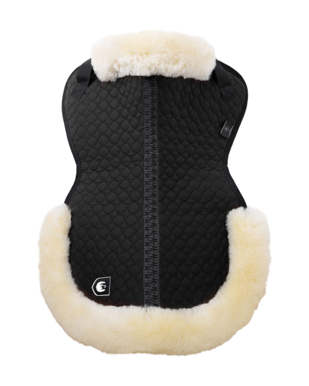 Die Oberseite des Pads besteht aus einem strapazierfähigen Satteldeckenstoff, der sowohl langlebig als auch leicht zu pflegen ist. Der hintere Fellrand aus Lammfell dient nicht nur als zusätzlicher Schutz, sondern verleiht dem Sattelpad auch eine optische Aufwertung.