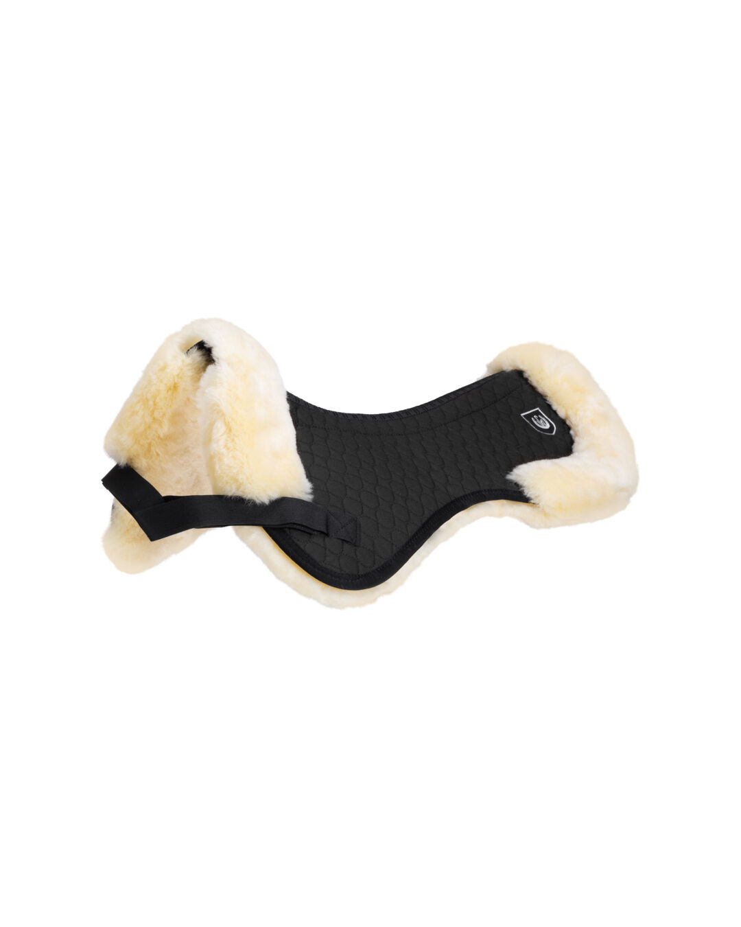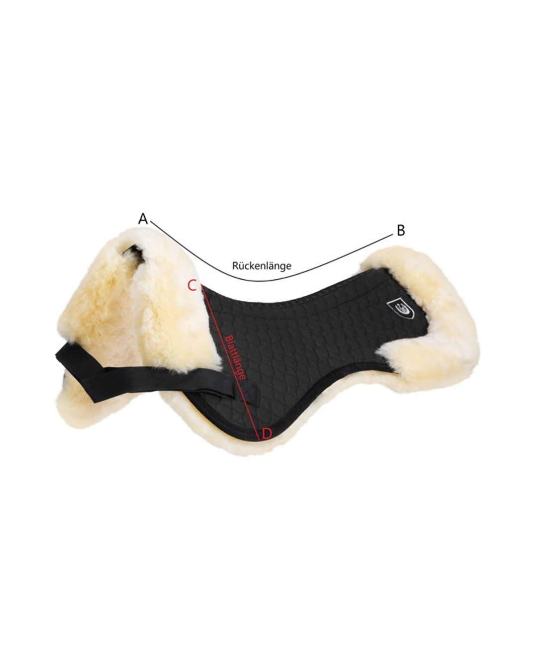 Der vordere und hintere Rand des Pads sind ebenfalls mit hochwertigem Lammfell versehen, was nicht nur als Sattelanlage dient, sondern auch als optischer Hingucker fungiert. Die Unterseite aus echtem Lammfell hat eine Wollhöhe von ca. 30 mm und sorgt für optimalen Komfort und Druckverteilung, während die restliche Oberseite aus einem speziellen Satteldeckenstoff gefertigt ist.