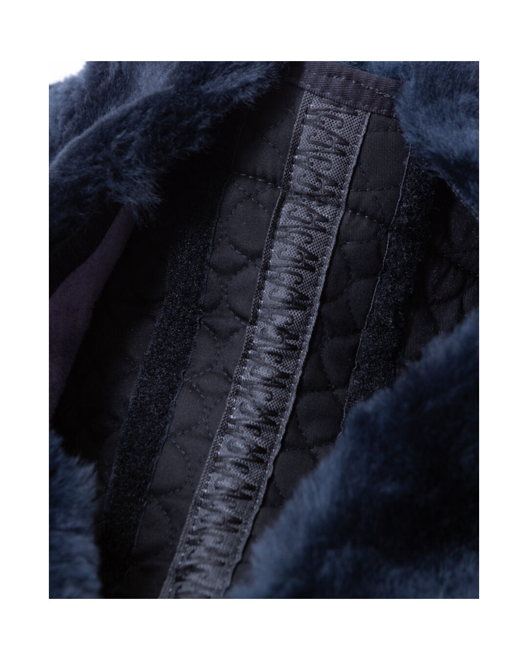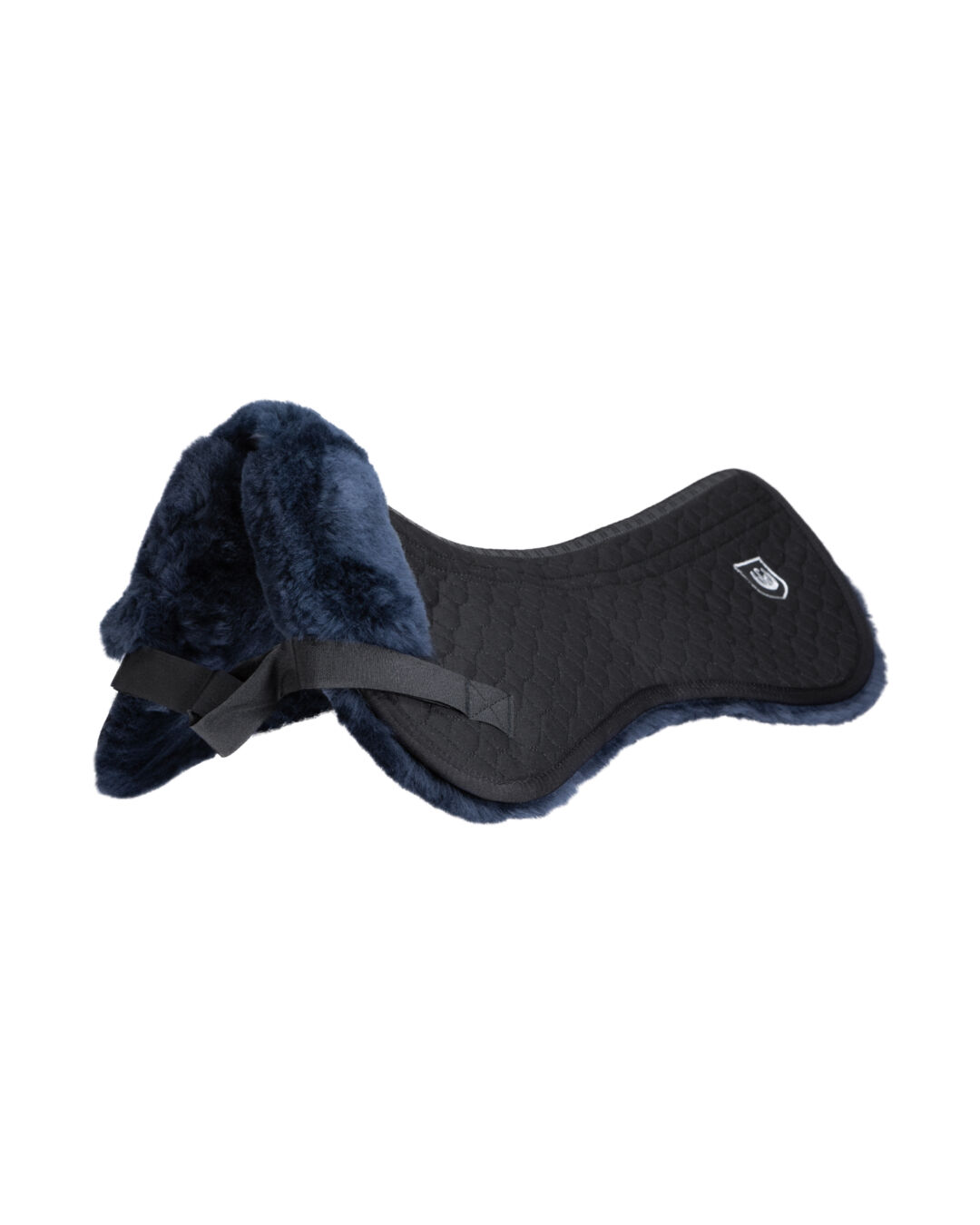 Die Unterseite des Pads besteht aus echtem Lammfell mit einer Wollhöhe von etwa 30 mm, was eine exzellente Druckverteilung und Luftzirkulation bietet, während die Oberseite aus strapazierfähigem Satteldeckenstoff gefertigt ist, der für Langlebigkeit und Beständigkeit sorgt. Im Bereich des Wirbelkanals ist bewusst kein Lammfell eingesetzt, um Druck auf die empfindliche Wirbelsäule zu vermeiden.