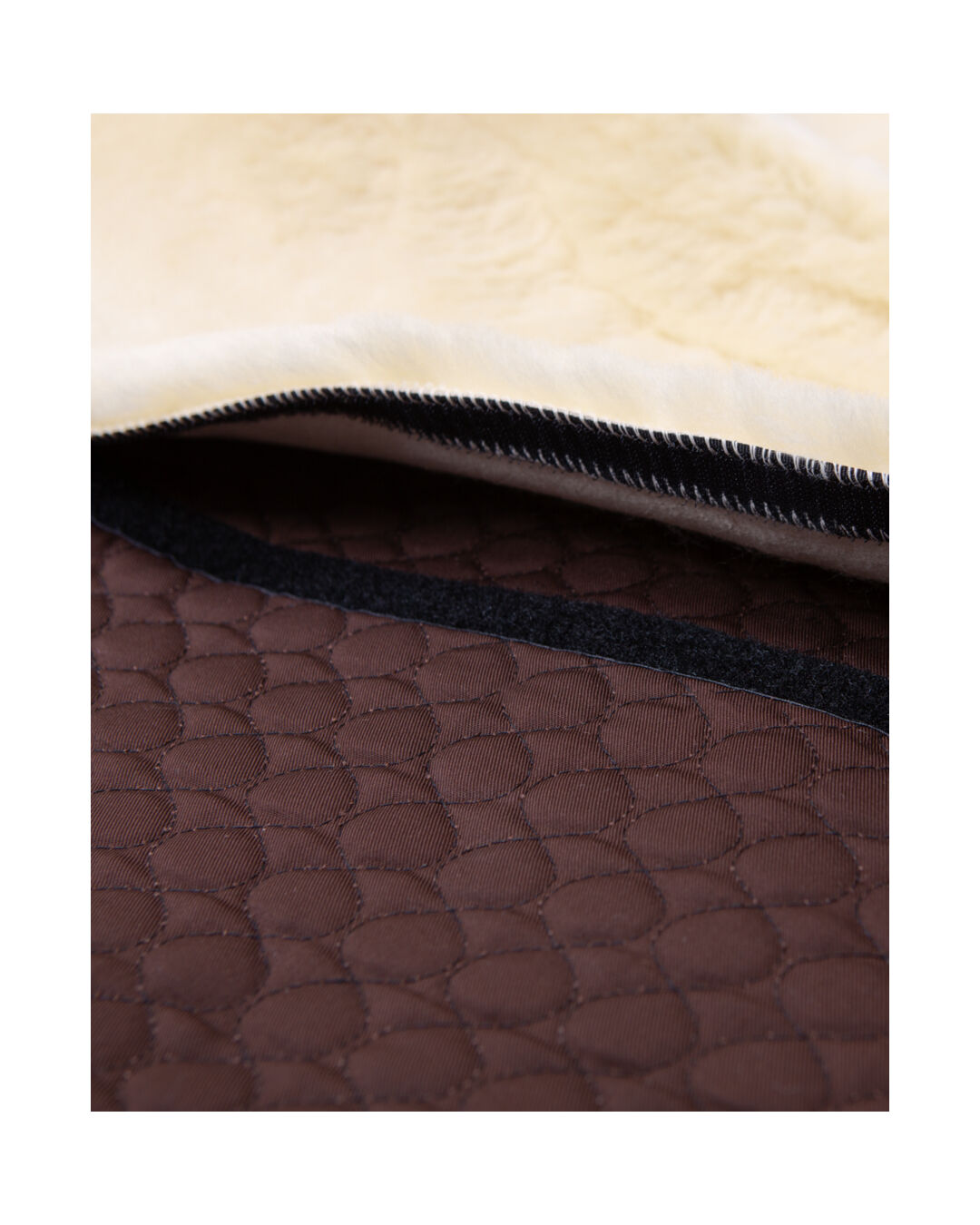 Die Schabracke ist aus hochwertigem, gegerbtem Lammfell hergestellt, das bekannt für seine atmungsaktiven und temperaturausgleichenden Eigenschaften ist. Die Oberseite der Schabracke wird aus einem speziellen Satteldeckenstoff gefertigt, der die Langlebigkeit und Robustheit erhöht. Eingearbeitete Einschubtaschen bieten zusätzliche Polstermöglichkeiten. Die Polster sind nicht Teil des Lieferumfangs und separat erhältlich.