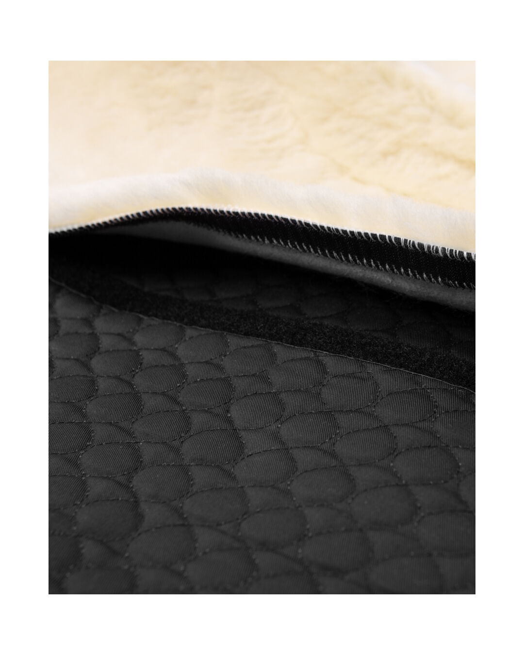 Die Schabracke ist aus hochwertigem, gegerbtem Lammfell hergestellt, das bekannt für seine atmungsaktiven und temperaturausgleichenden Eigenschaften ist. Die Oberseite der Schabracke wird aus einem speziellen Satteldeckenstoff gefertigt, der die Langlebigkeit und Robustheit erhöht. Eingearbeitete Einschubtaschen bieten zusätzliche Polstermöglichkeiten. Die Polster sind nicht Teil des Lieferumfangs und separat erhältlich.