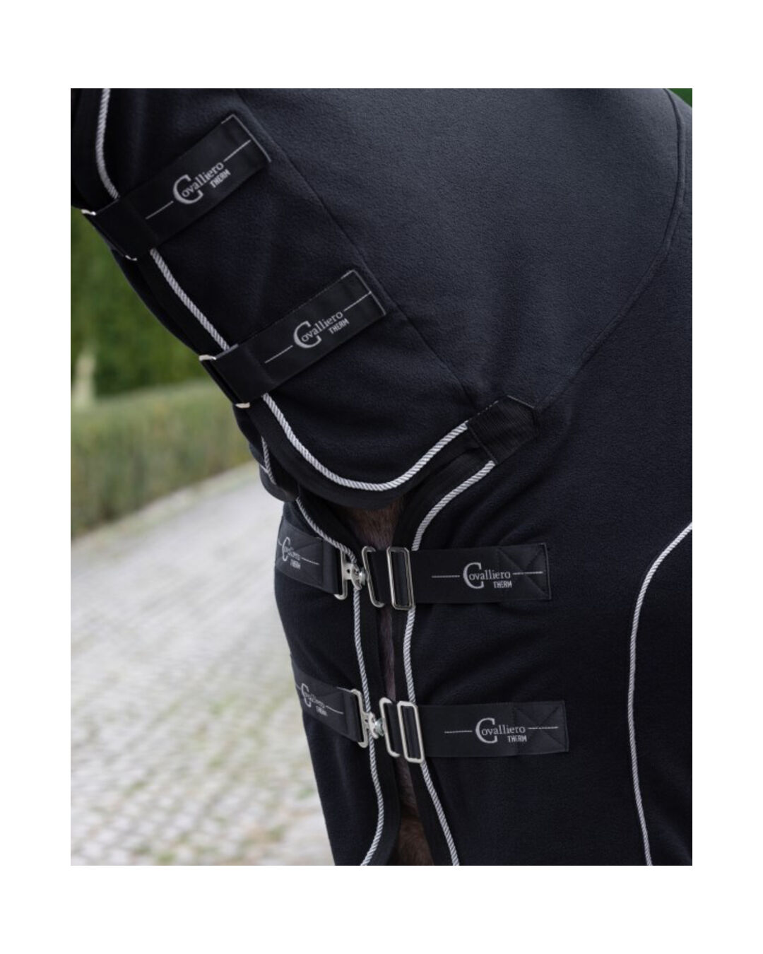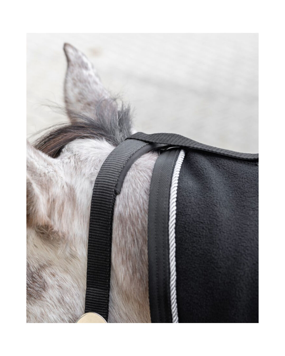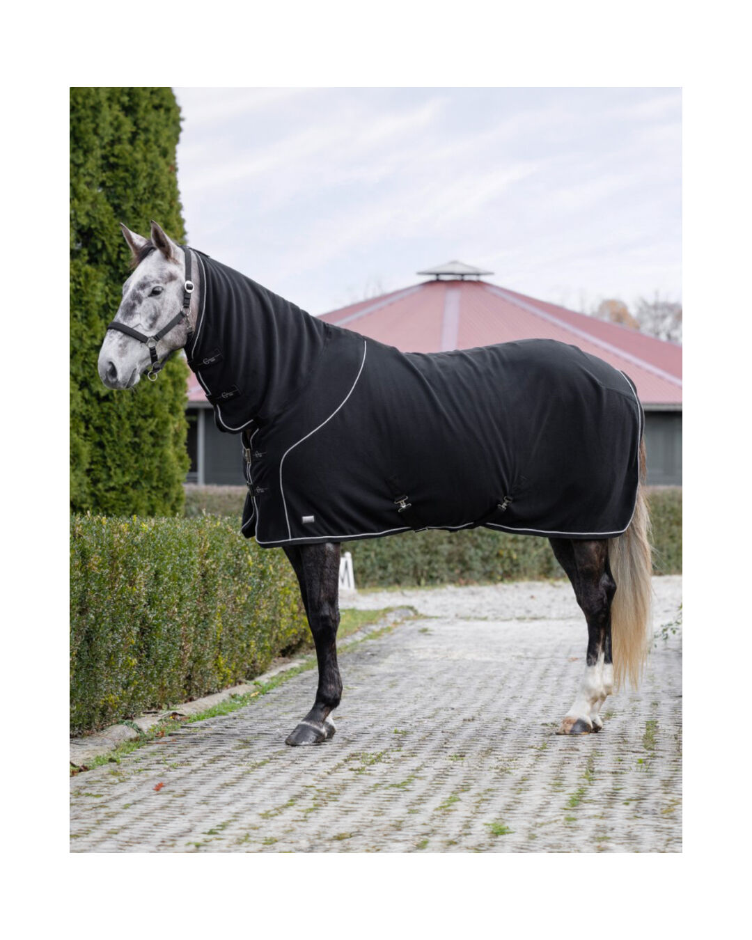 Die hochgeschlossene Fleecedecke ist atmungsaktiv und schnelltrocknend, was sie ideal als Abschwitzdecke nach dem Training oder als wärmende Transportdecke macht. Die Kombination aus flexibler Passform, zweifacher Brustverschnallung mit T-Schnallen und verstellbarer Kreuzbegurtung sorgt für einen sicheren Sitz, während der Schweifriemen zusätzlichen Halt gibt.