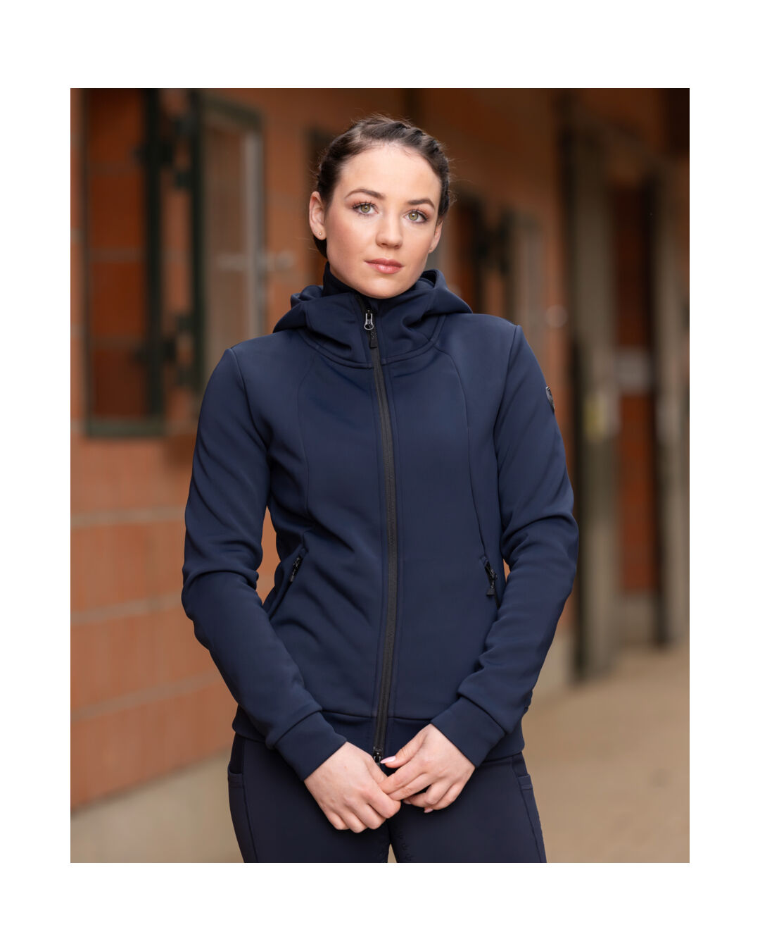Mit ihrem taillierten Schnitt passt sich die Jacke optimal an deine Silhouette an und bietet dank des weichen Materials einen hohen Tragekomfort. Die Kapuze lässt sich bei Bedarf mit einem Druckknopf fixieren und bleibt so auch bei Bewegung in Position. Zwei praktische Einschubtaschen bieten Platz für Handy, Schlüssel oder Leckerlis. Der 2-Wege-Reißverschluss sorgt für mehr Bewegungsfreiheit – besonders beim Reiten.