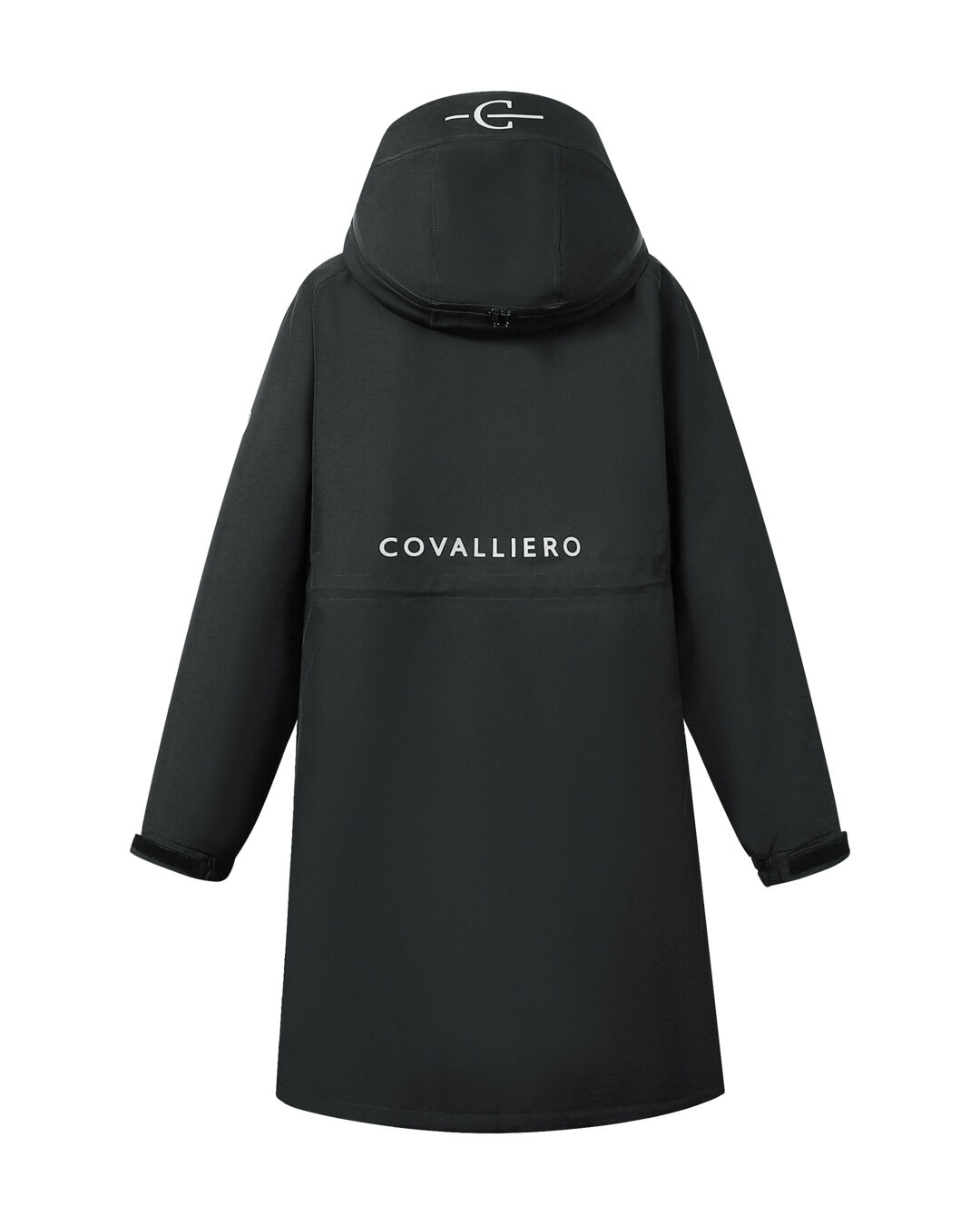 Die Kapuze ist per Kordelzug individuell anpassbar, lässt sich ausklappen und bei Bedarf mit einem Druckknopf fixieren. Für Reiter:innen besonders praktisch: innenliegende elastische Beinfixierungen mit Klettverschluss sorgen dafür, dass der Mantel beim Reiten nicht verrutscht. Die reflektierenden Applikationen erhöhen die Sichtbarkeit in der dunklen Jahreszeit, während die magnetische Windschutzleiste und der 2-Wege-Reißverschluss dich zuverlässig vor Wind und Wetter schützen.