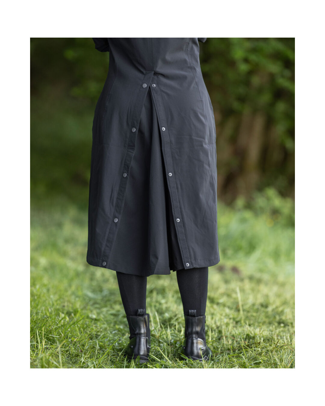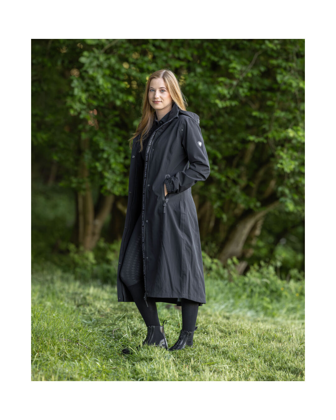 Die abnehmbare Kapuze lässt sich per Druckknopf sicher fixieren und nach Bedarf abnehmen. Ein Reitschlitz mit Druckknöpfen ermöglicht es dir, den Mantel auch im Sattel bequem zu tragen, ohne dass er verrutscht. Der 2-Wege-Reißverschluss sorgt für zusätzliche Flexibilität und Bewegungsfreiheit.