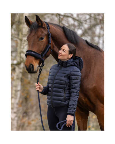 Der feminine, taillierte Schnitt sorgt für eine schöne Silhouette, während der elastische Abschluss an Saum und Ärmeln optimalen Sitz garantiert. Die Kapuze ist per Knopf fixierbar und kann bei Bedarf auch komplett abgenommen werden – ideal für flexible Einsätze im Stall oder im Alltag.