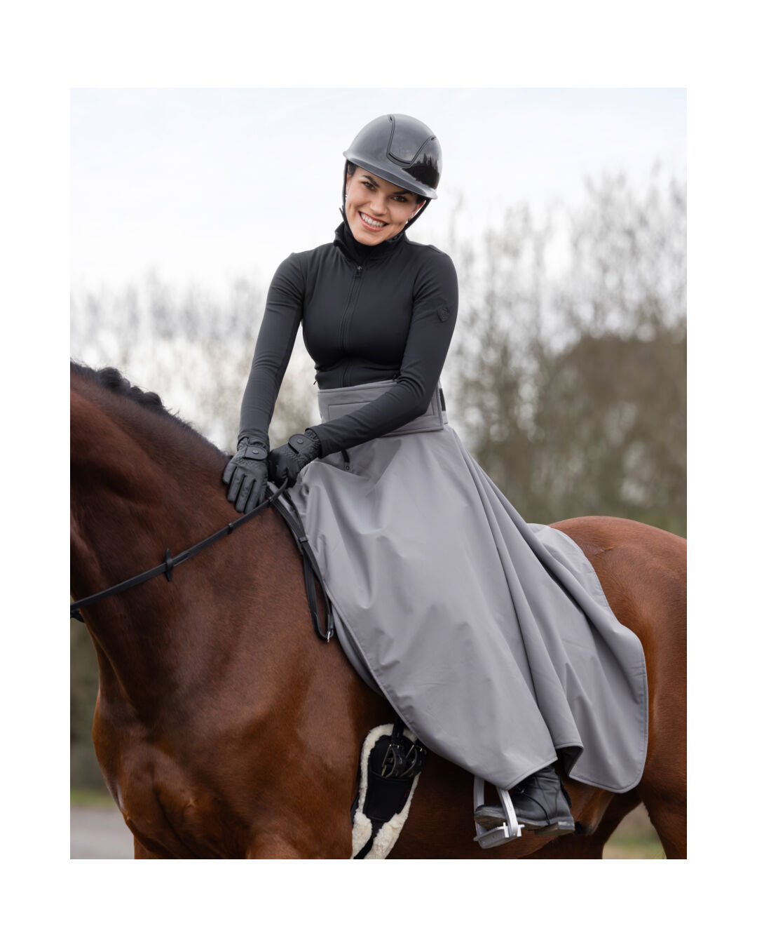 Dank des verstellbaren Bunds mit Klettverschluss lässt sich der Rock ganz einfach über der Reithose tragen. Die flauschige Fleece-Innenseite sorgt für wohlige Wärme, während das wasserdichte Außenmaterial (bis 10.000 mm Wassersäule) dich zuverlässig trocken hält. Gleichzeitig bleibt der Rock atmungsaktiv – ideal für aktive Tage im Stall.