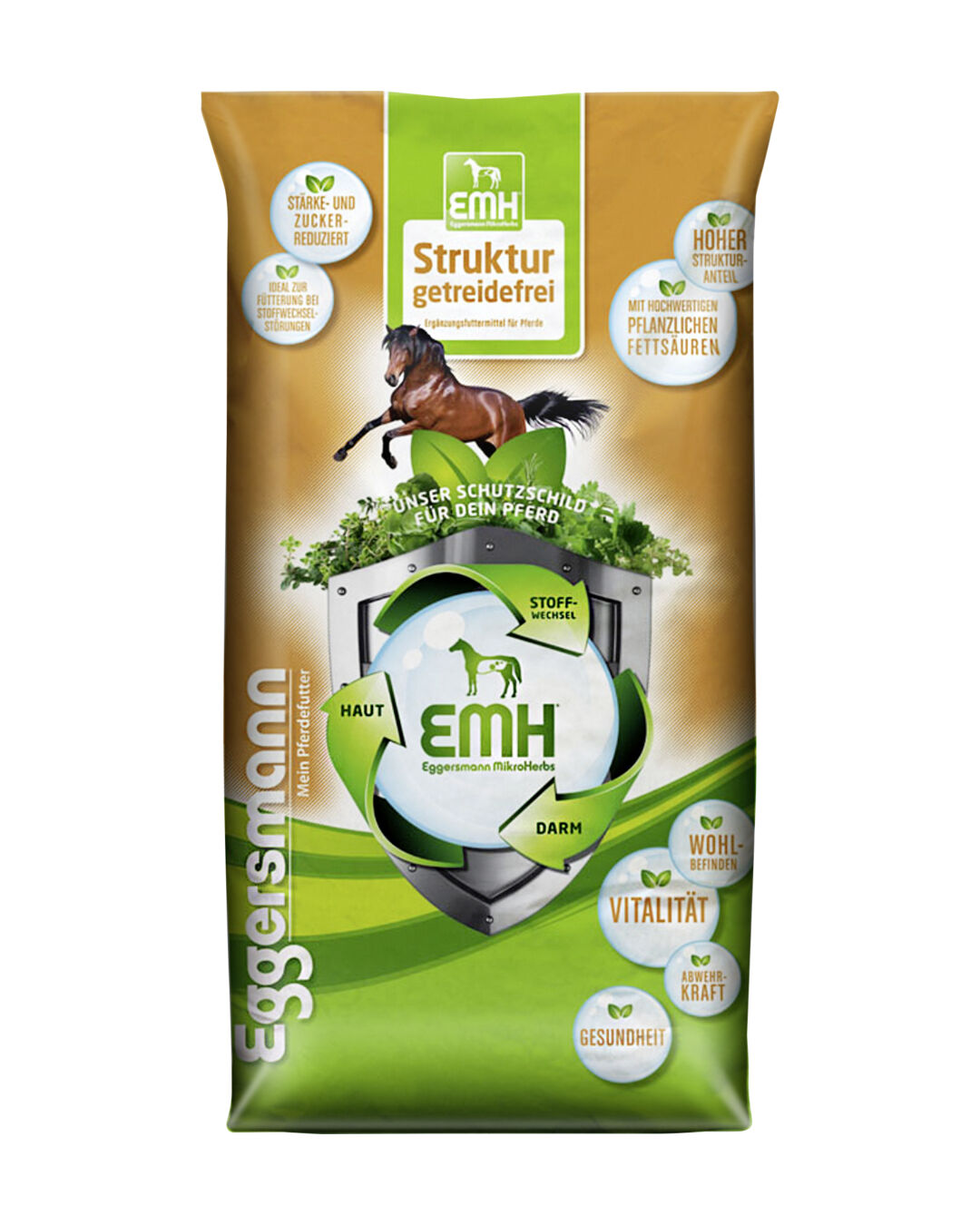Das Müsli Stuktur getreidefrei von Eggersmann mit hochverdaulicher, intakter Rohfaser ist für die Fütterung stoffwechselerkrankter oder -empfindlicher Pferde konzipiert.