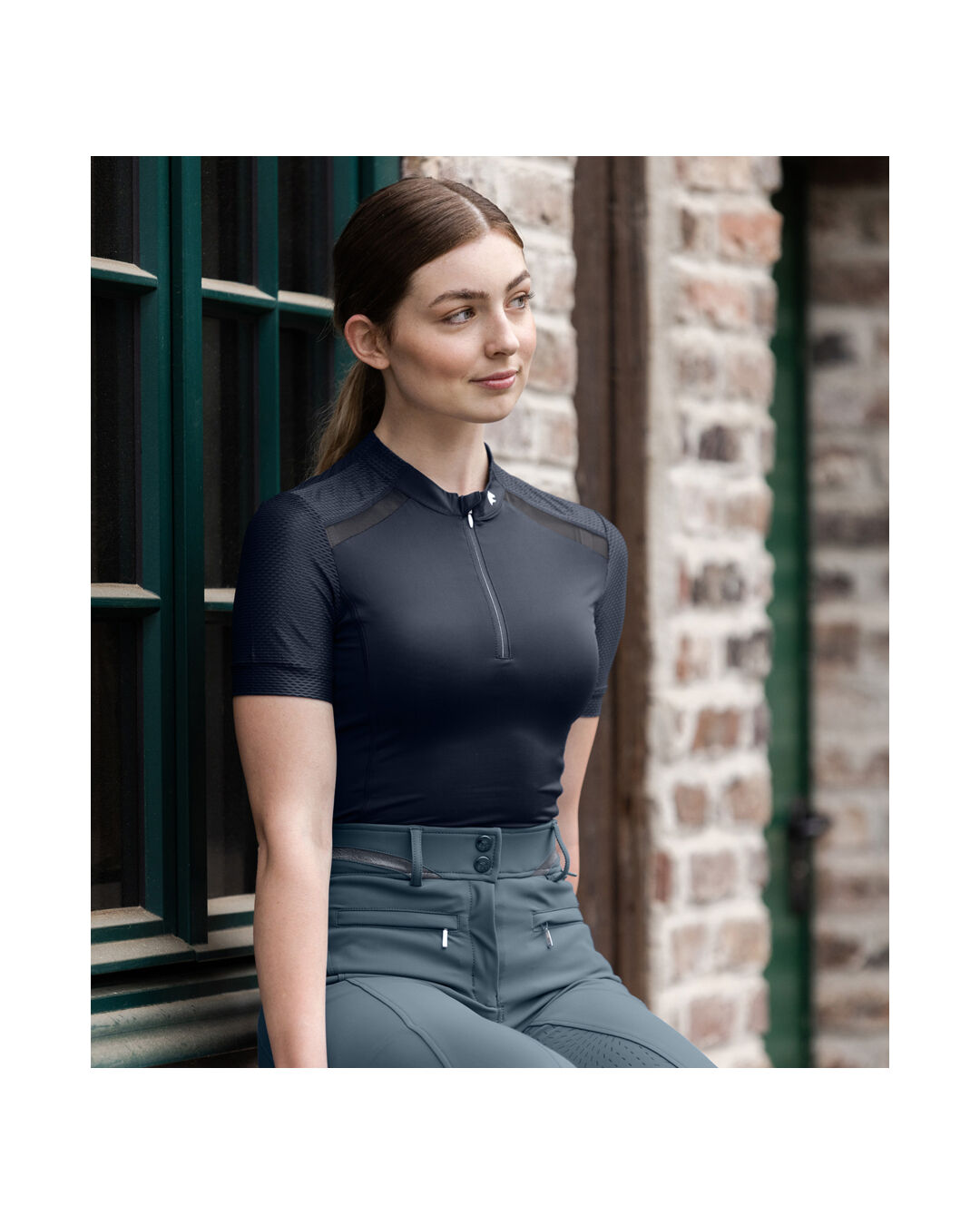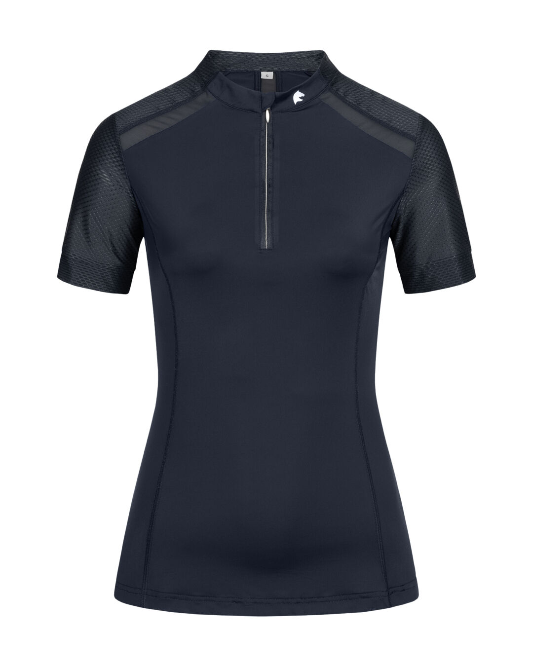 Dieses Kurzarmshirt besticht durch seine taillierte Passform und das atmungsaktive Funktionsmaterial, das für höchsten Tragekomfort sorgt. Feine Mesh-Einsätze an Schultern und Rückenmitte garantieren dir eine optimale Belüftung, während die Ärmel und Schulterpartien mit einer wabenstrukturierten Mesh-Oberfläche das Design abrunden. Der Reißverschluss mit Kinnschutz und der glitzernde Logo-Print am Kragen verleihen dem Shirt eine exklusive Note.