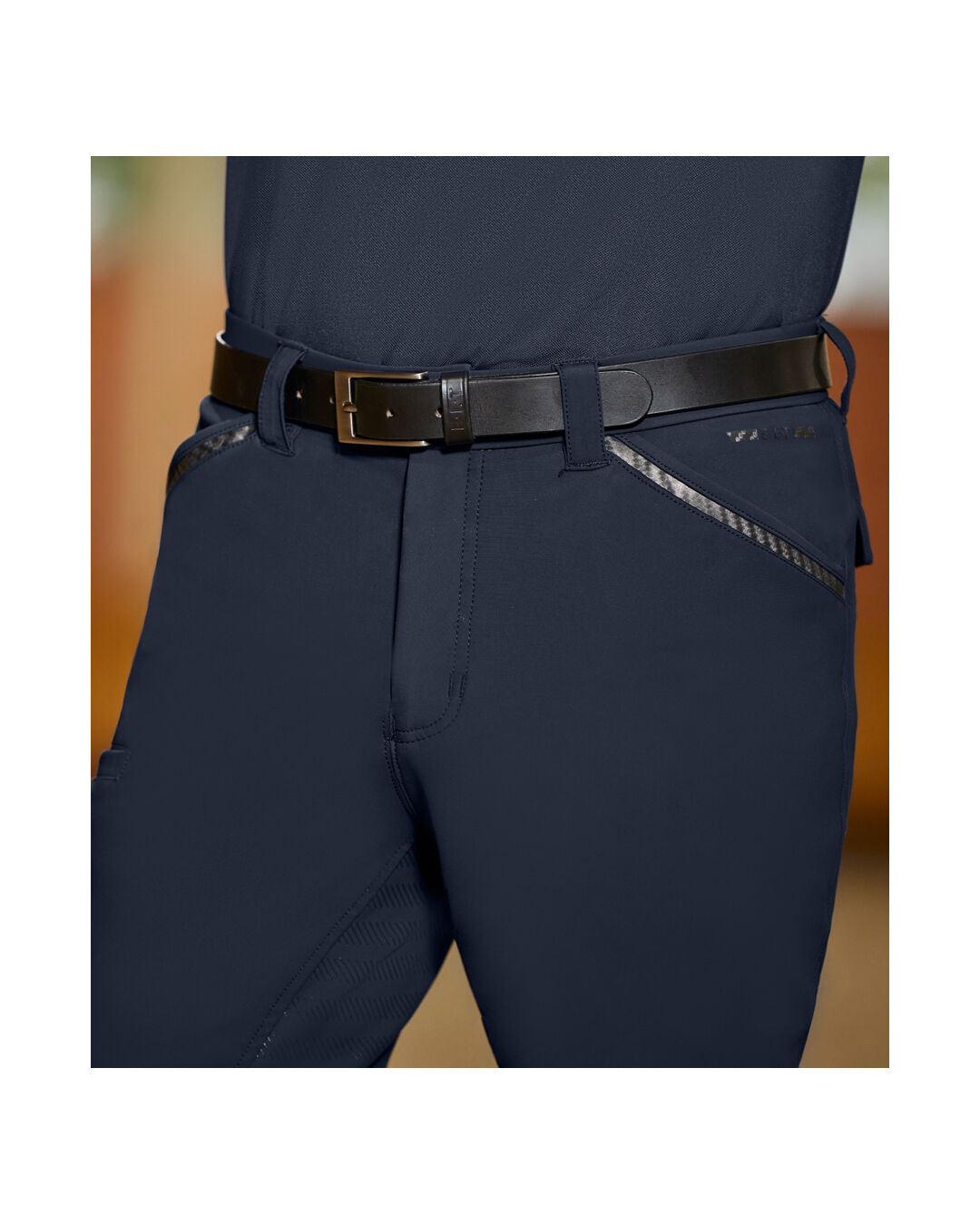 Die Reithose ist zudem praktisch ausgestattet mit Eingrifftaschen mit Carbon-Tape auf der Vorderseite, aufgesetzten Patten-Taschen mit Knopf auf der Rückseite sowie einer speziellen Handy-Einschubtasche. Abgerundet wird das Design durch das ELT Logo in Carbon-Optik.
