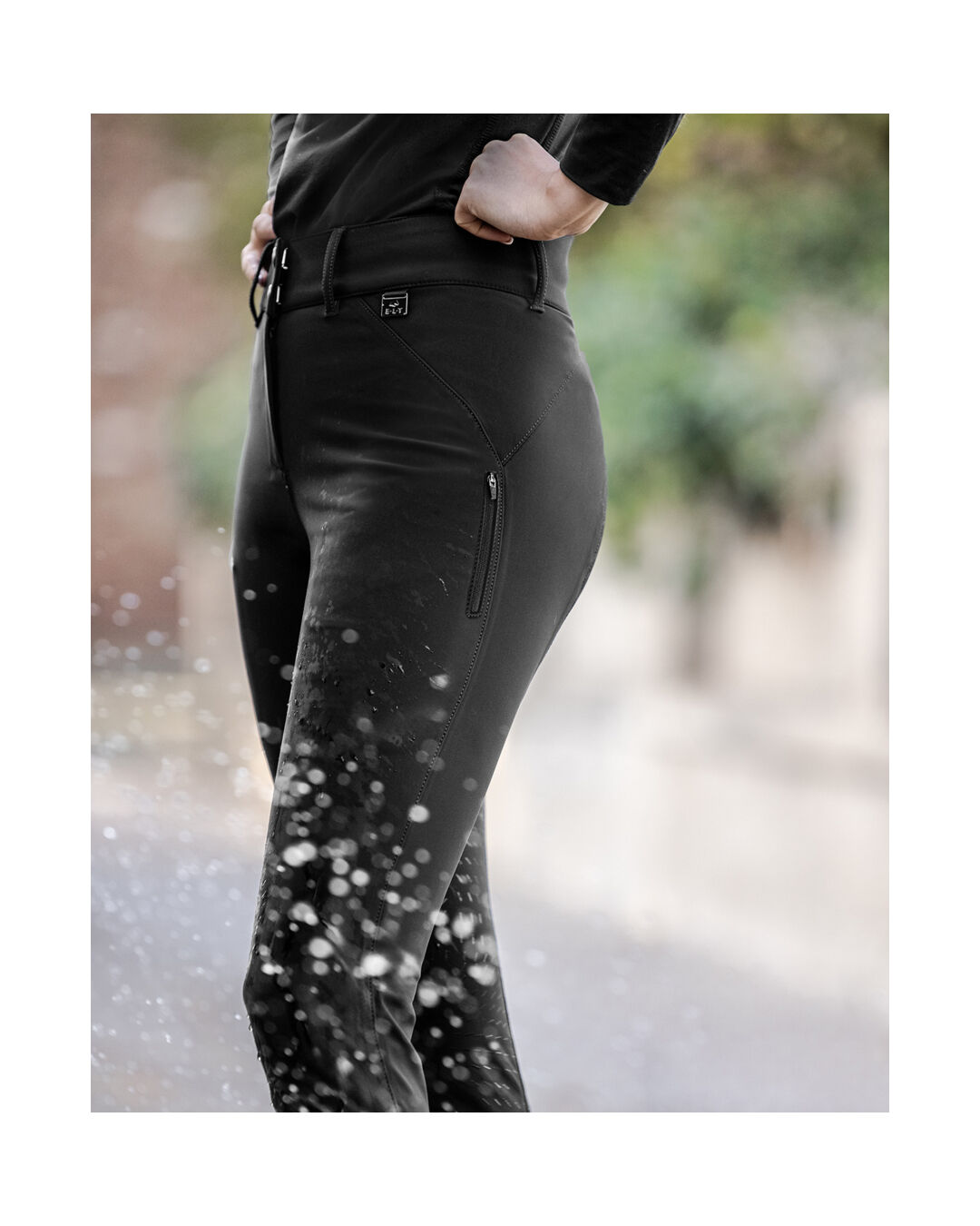 Diese Reithose zeichnet sich durch einen Silikon-Vollbesatz aus, der einen hervorragenden Halt im Sattel bietet. Der E·L·T Logo-Silikonprint ist geschickt im Besatz integriert und verleiht der Hose ein modernes, sportliches Aussehen. Die Wasserdichtigkeit mit einer Wassersäule von 5.000 mm und die versiegelten Seitennähte schützen effektiv vor Nässe, was diese Hose ideal für wechselhafte Wetterbedingungen macht.