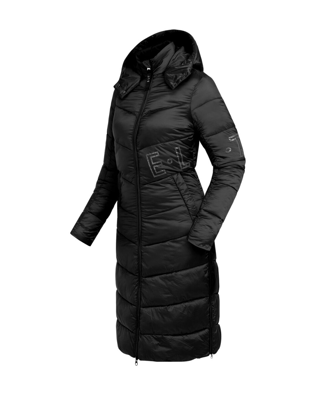 Für die Bewegungsfreiheit beim Reiten sorgen seitliche Reitschlitze mit hochwertigen Reißverschlüssen in Metalloptik. Die durchgesteppte Innenverarbeitung mit gepaspelten Nähten betont die Qualität und Langlebigkeit dieses Mantels. Der E·L·T-Schriftzug am Vorderteil setzt ein modisches Statement.