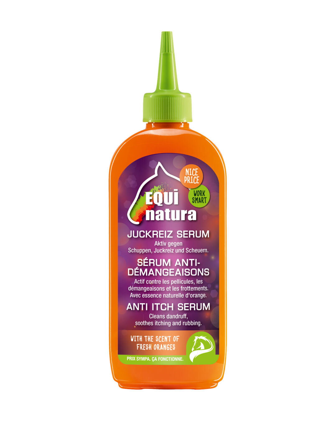 Das im Serum enthaltene Klettenwurzelöl wirkt nicht nur antibakteriell, sondern hilft auch dabei, die Vermehrung von Bakterien zu stoppen, die Ekzeme und Hautprobleme verursachen können. Bei regelmäßiger Anwendung bleibt die Haut gesund und das Haar kräftig und glänzend. Zusätzlich verleiht der Duft frischer Orangen dem Serum eine angenehme Note, die nicht nur deinem Pferd, sondern auch dir gefallen wird.