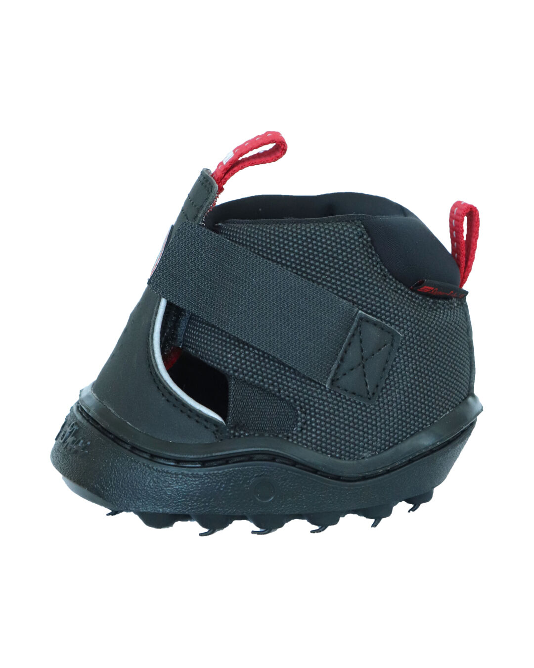 Bitte beachte, dass die Griff-Fähigkeit des Hufschuhs sich bei nassem Untergrund anders verhält. Berücksichtige stets die Sicherheit für dein Pferd. Separat erhältliche Hufschuh-Spikes können jederzeit an der Sohle befestigt werden (unter zusätzlicher Verwendung eines Dämpfungspolsters).