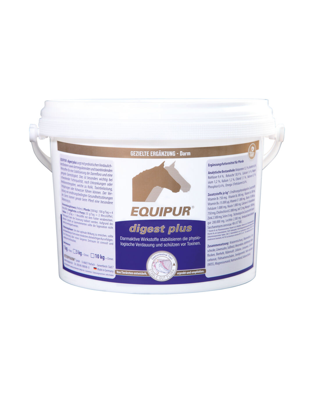 Das Ergänzungsfutter Digest Plus von EQUIPUR unterstützt gezielt die Darmgesundheit deines Pferdes durch eine Kombination darmaktiver Wirkstoffe. Diese stabilisieren die Verdauung und bieten Schutz vor schädlichen Toxinen.