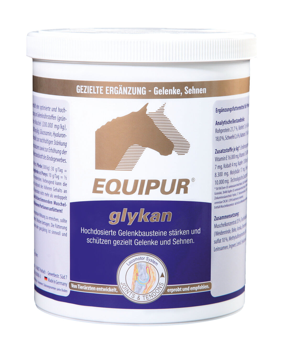 Das Ergänzungsfutter glykan von EQUIPUR liefert hochdosierte Gelenkbausteine, die gezielt die Gesundheit von Gelenken und Sehnen unterstützen und schützen.