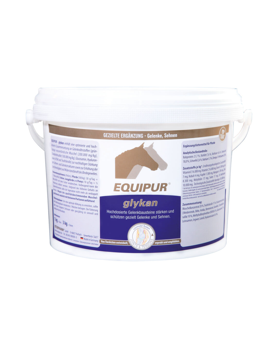 Das Ergänzungsfutter glykan von EQUIPUR liefert hochdosierte Gelenkbausteine, die gezielt die Gesundheit von Gelenken und Sehnen unterstützen und schützen.