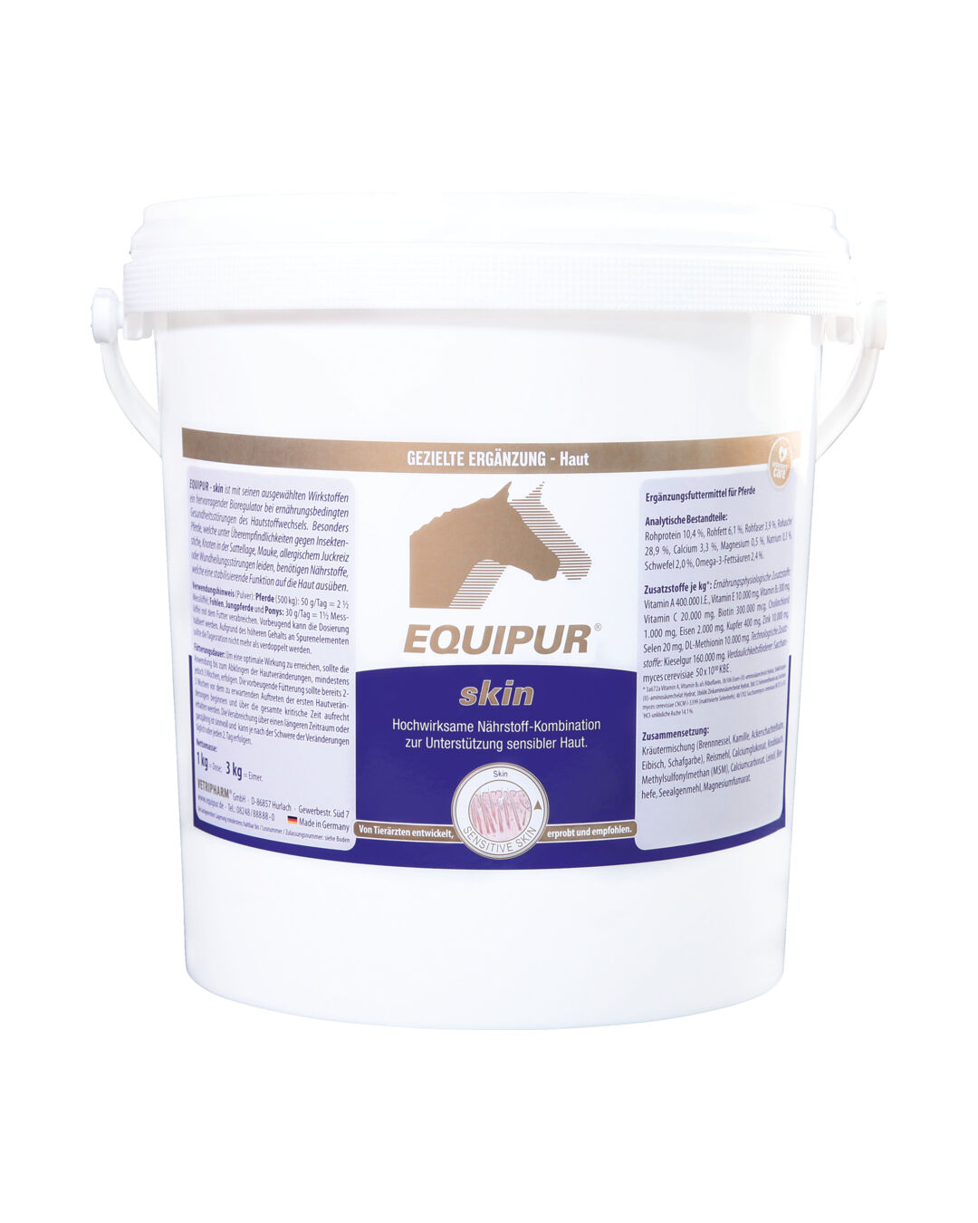 Das Ergänzungsfutter Skin von EQUIPUR ist eine hochwirksame Nährstoffkombination, die gezielt zur Unterstützung der sensiblen Haut deines Pferdes entwickelt wurde. Diese besondere Formel dient als Bioregulator und hilft bei ernährungsbedingten Hautproblemen.