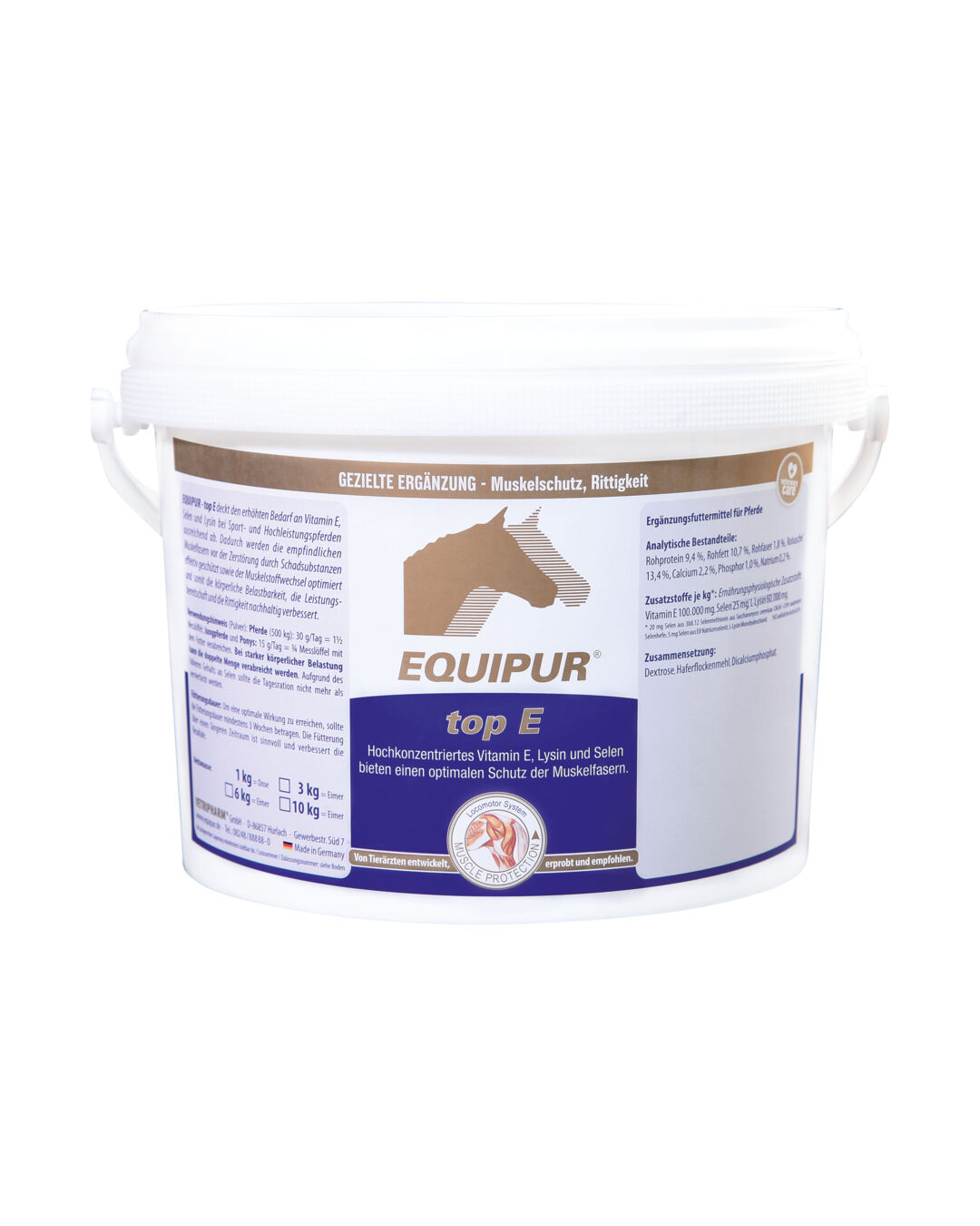 Das Ergänzungsfutter top E von EQUIPUR ist das ideale Ergänzungsfutter für Sport- und Hochleistungspferde, die einen erhöhten Bedarf an Vitamin E, Selen und Lysin haben.