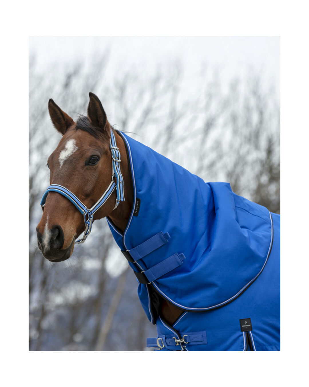 Hergestellt aus strapazierfähigem, wasserdichtem und atmungsaktivem 1200D Ripstop-Polyester, hält das Halsteil dein Pferd bei jedem Wetter zuverlässig trocken. Das reibungsarme und antistatische Nylonfutter sorgt für maximalen Komfort und verhindert Scheuerstellen. Das Halsteil lässt sich optimal mit den Equitheme Tyrex Decken kombinieren.