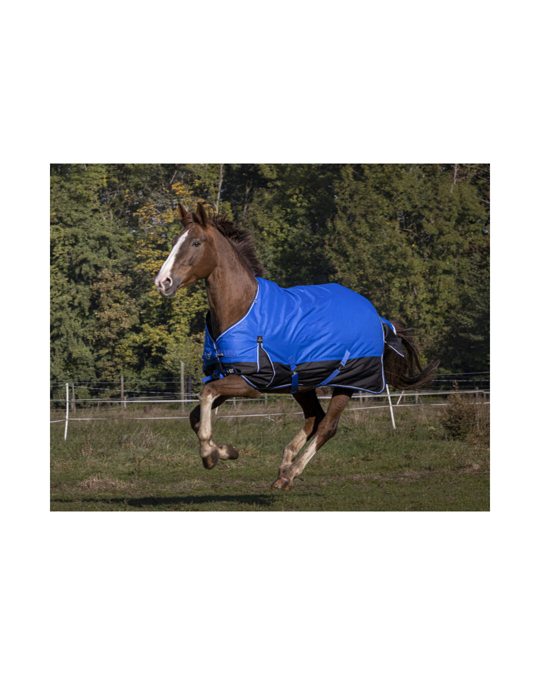 Ausgestattet ist die Decke mit einem großen, wasserdichten Schweiflatz, der ein integriertes Reflexionsband aufweist. Gehfalten, ein Widerrist Pad aus synthetischem Lammfell innerhalb der Decke und niedrig angesetzte Kreuzgurte sowie Beinschnüren sind weitere praktische Merkmale dieser Decke. Am Brustteil ist sie mit einem Schnellverschlusssystem versehen, mit Klettriemen verstärkt und die Deckengröße gut sichtbar vermerkt.