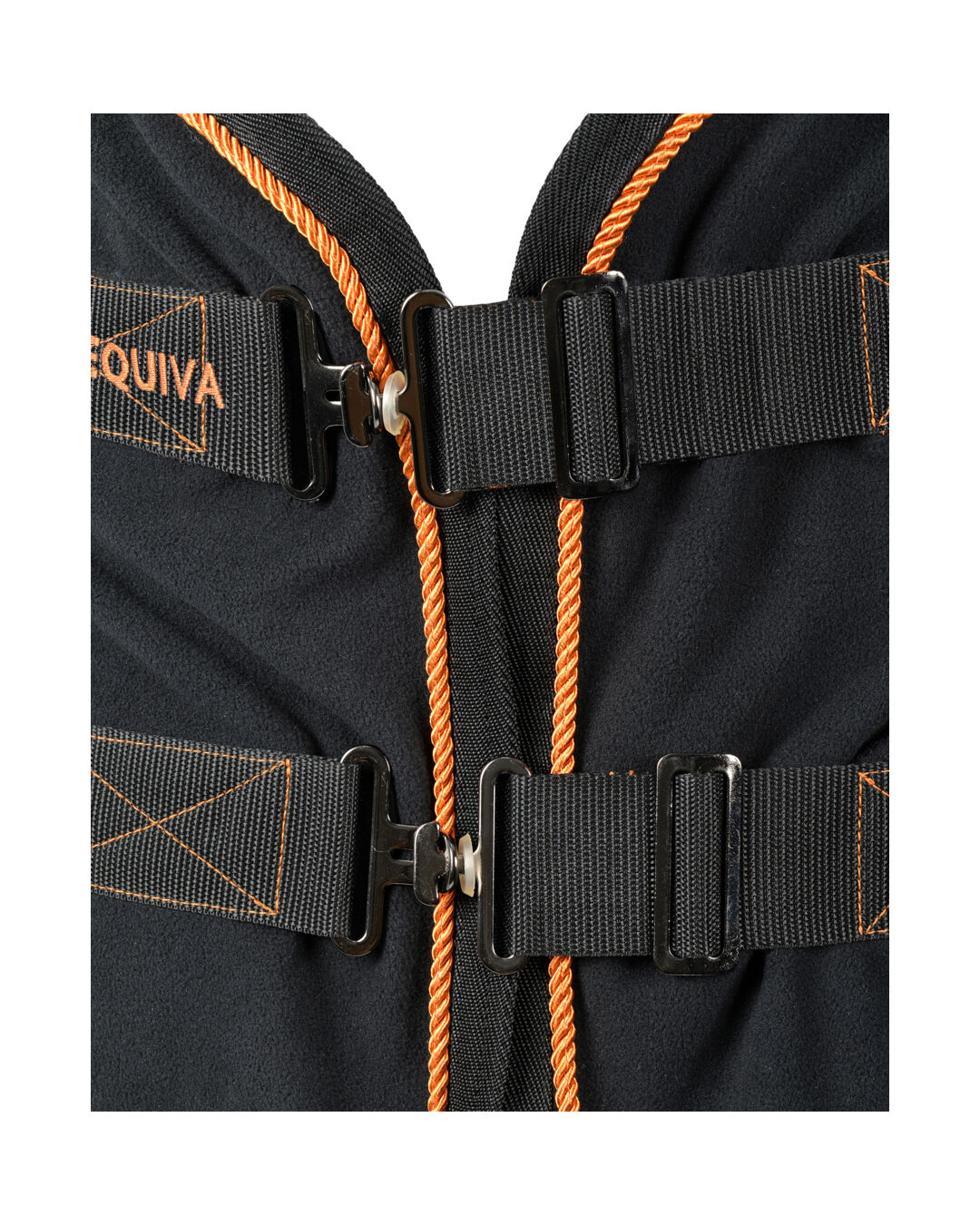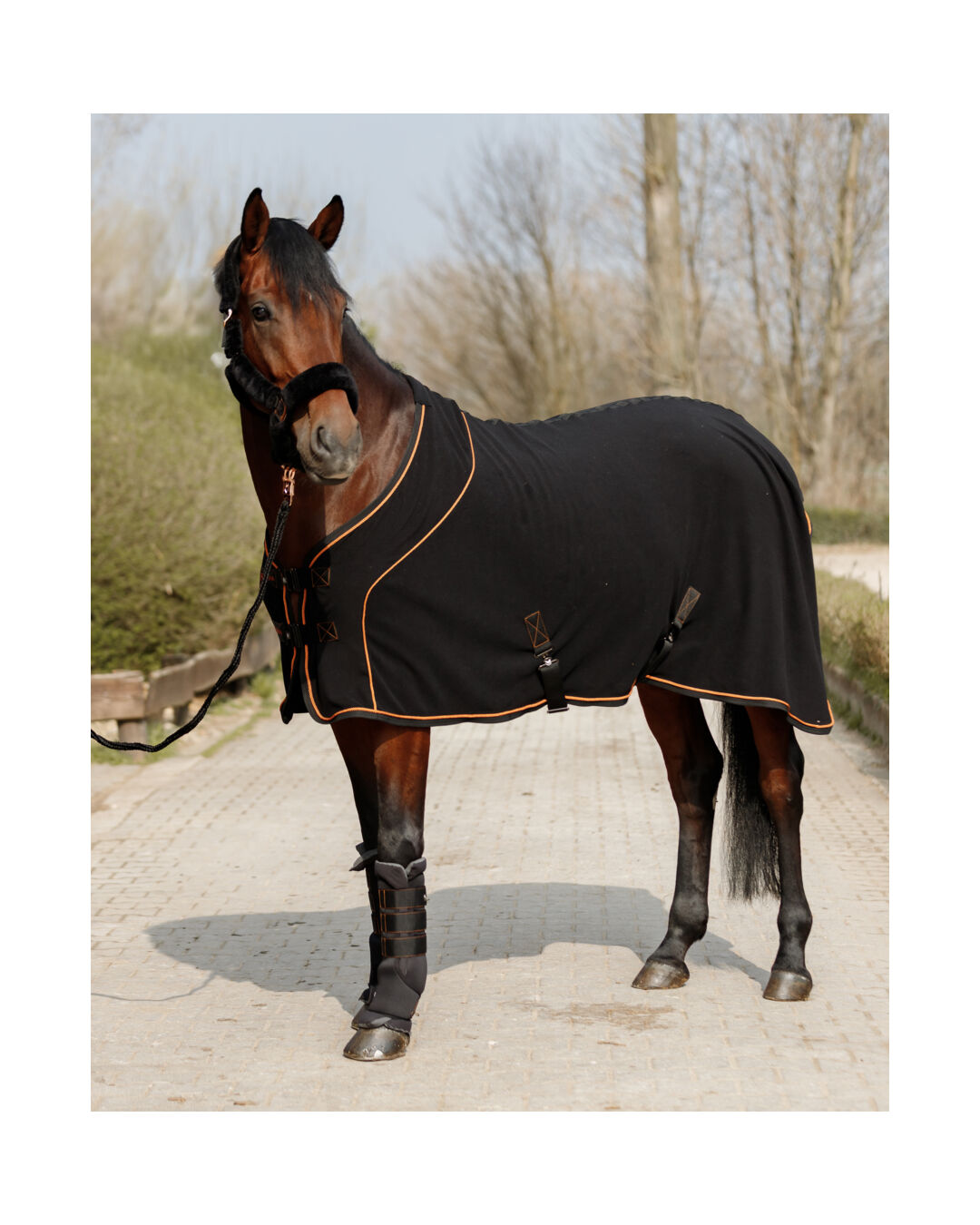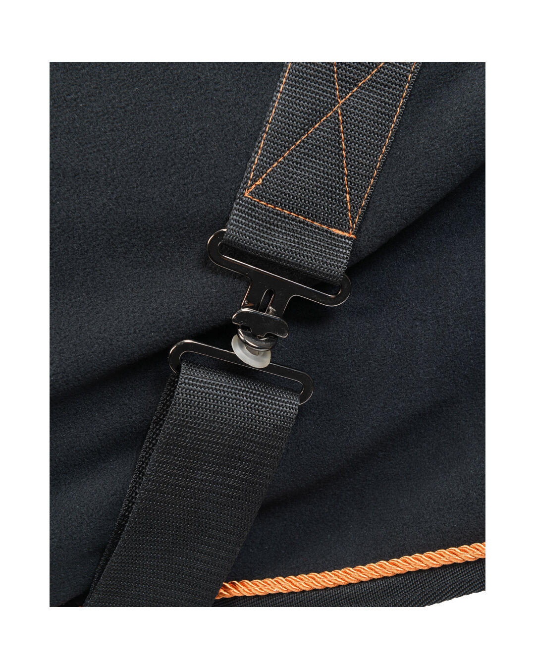 Die Decke ist atmungsaktiv und schnell trocknend, was eine optimale Schweiß- und Feuchtigkeitsregulierung gewährleistet und Hitzestau unter der Decke verhindert. Durch die zweifache Brustverschnallung mit Dornschnallen, die verstellbare Kreuzbegurtung und den Schweifriemen sitzt die Decke sicher und bleibt auch bei Bewegungen an Ort und Stelle.
