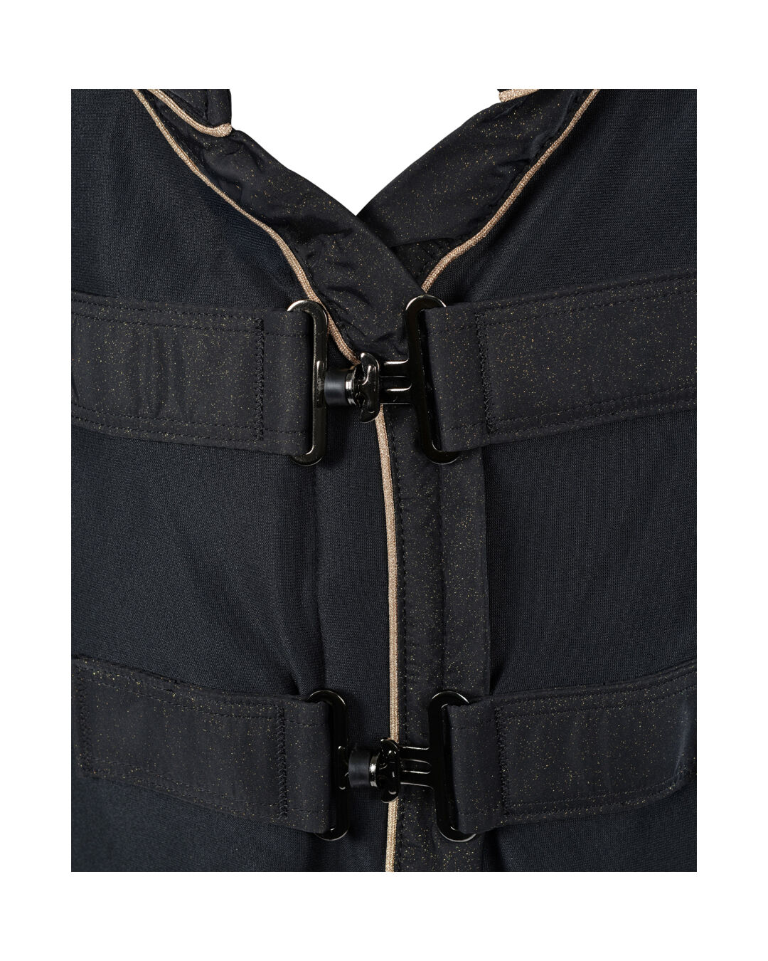 Die Decke zeichnet sich durch einen schimmernden Einfass am Hals aus, der ihr eine besonders edle Optik verleiht und sicherstellt, dass dein Pferd stets stilvoll aussieht. Die abnehmbaren Bauchgurte ermöglichen eine einfache Anpassung und Handhabung, während der zweifache T-Frontverschluss einen sicheren und passgenauen Sitz bietet.