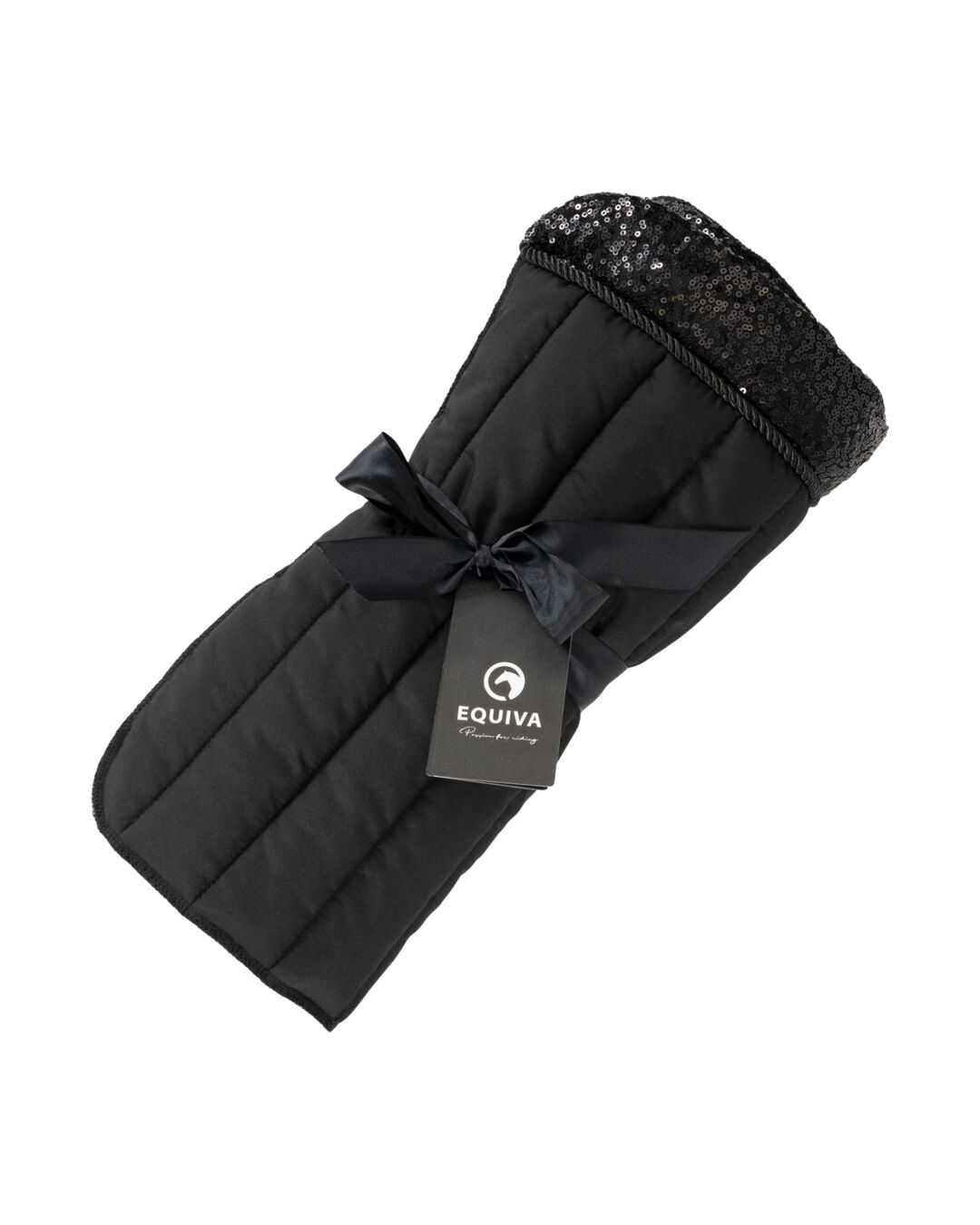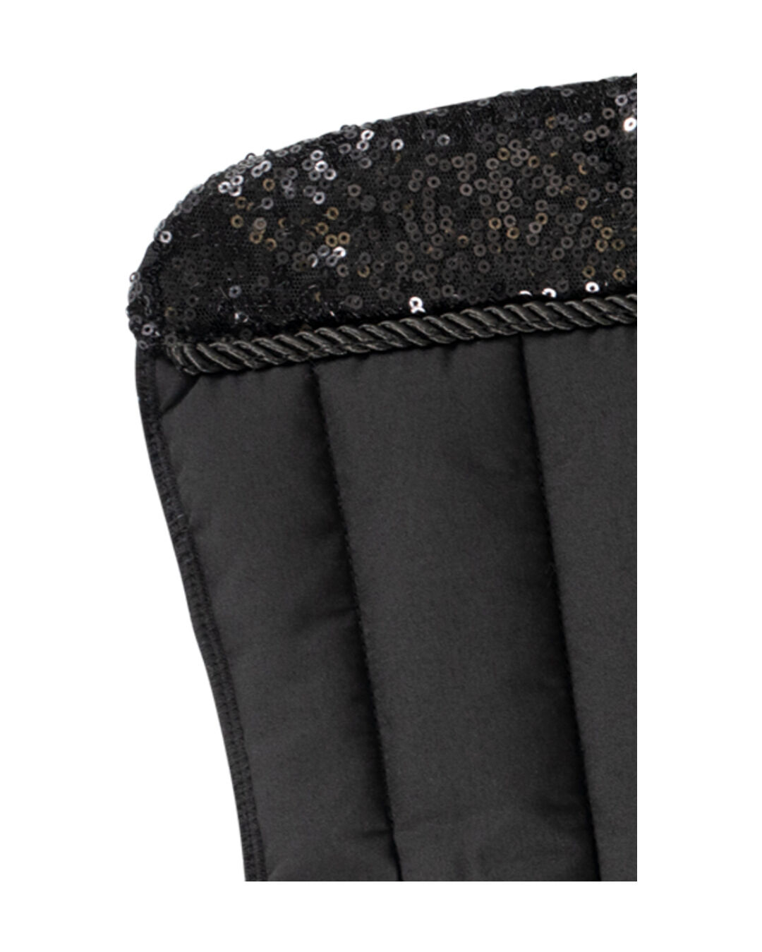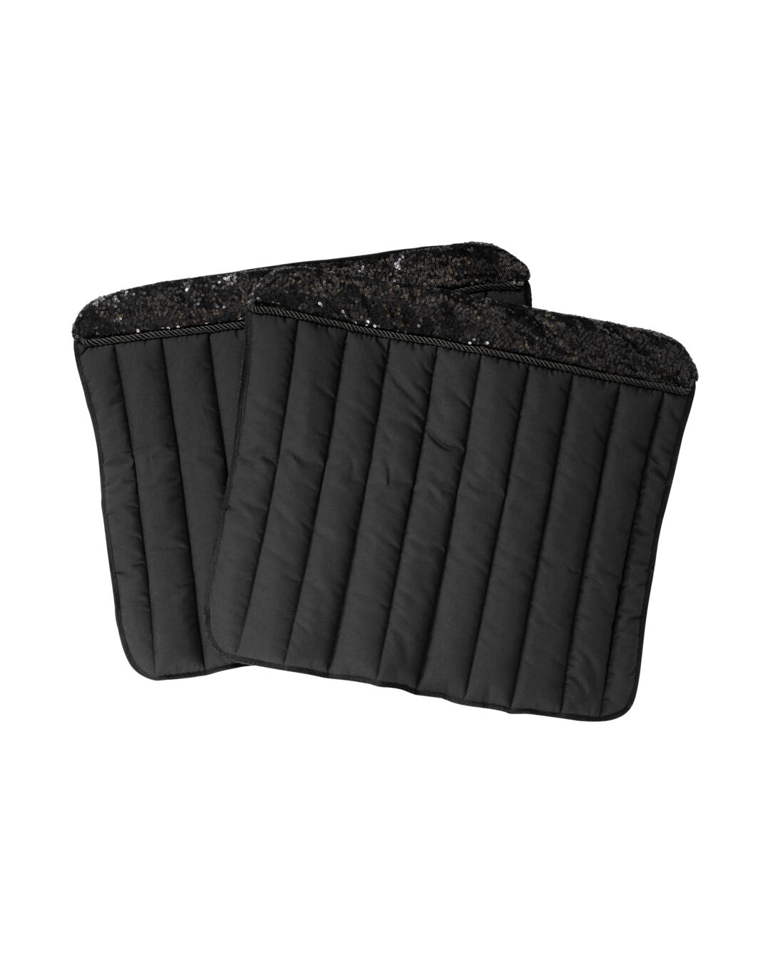 Die glitzernde Pailletten Borde und die Ton-in-Ton Zierkordel verleihen diesen Bandagierunterlagen einen edlen Look, der sich bei jeder Gelegenheit sehen lassen kann. Die Bandagierunterlagen sind so konzipiert, dass sie in Kombination mit allen Arten von Bandagen verwendet werden können. Sie sind so positionierbar, dass die glitzernde Borde als attraktive Zierde übersteht, während die Unterlage selbst ausreichend lang ist, um einen umfassenden Schutz des Pferdebeins zu gewährleisten.