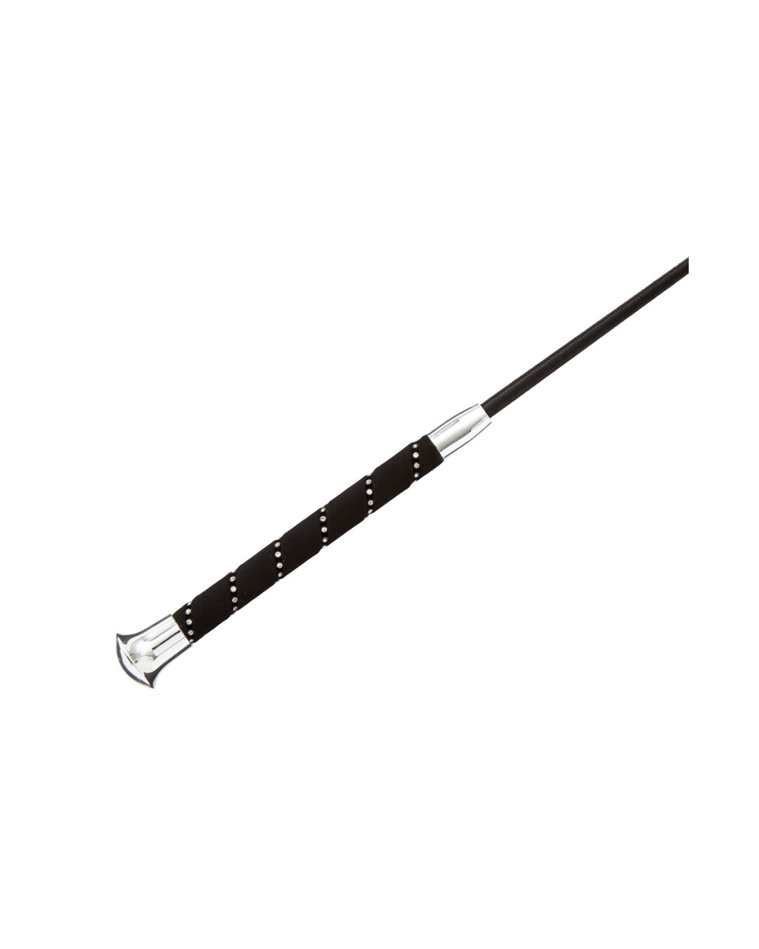 Der weiche Kunstledergriff liegt angenehm in der Hand und sorgt für einen optimalen Halt während des Reitens. Ein besonderes Highlight ist der mit funkelnden Strasssteinen verzierte Griff, der der Gerte einen Hauch von Glamour verleiht. Eine silberne Applikation rundet das elegante Erscheinungsbild ab.