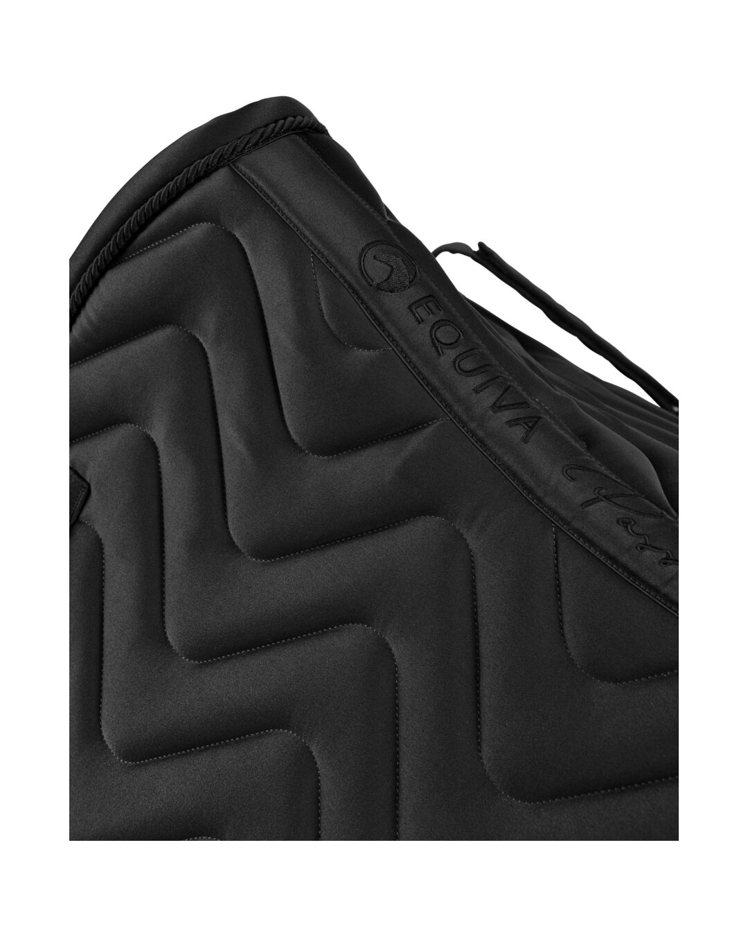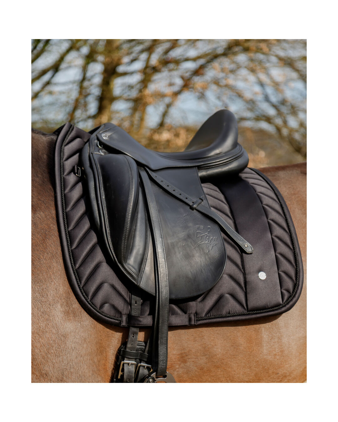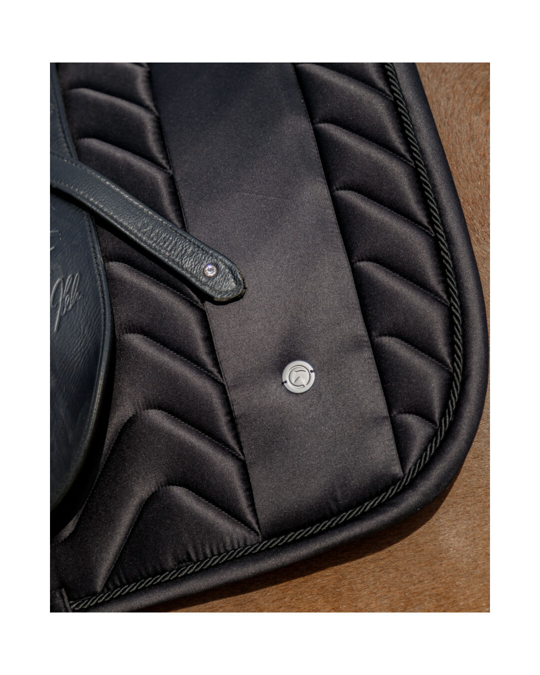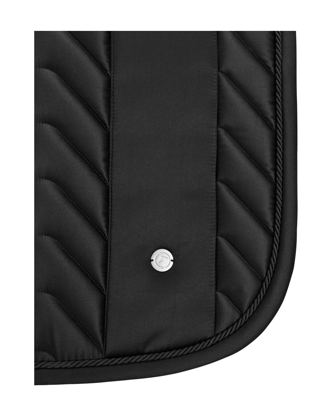 Besondere Extras wie die glänzenden vertikalen Streifen und das Pferdekopf-Logo in einem runden Metallplättchen verleihen der Schabracke einen edlen Look. Die Aufschrift „Passion for Riding“ befindet sich auf dem Rückenkanal oben und rundet das Design ab. Die farblich abgestimmte Kordelpaspelierung fügt sich nahtlos in das Gesamtbild ein.