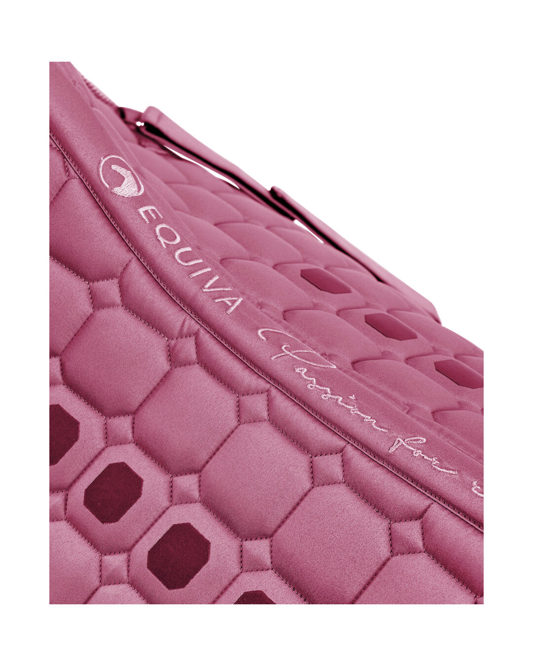 Der Rückenkanal ist oben mit einem Logo-Print versehen: ein Pferdekopf zusammen mit dem Schriftzug "EQUIVA" und "Passion for riding". Auf beiden Seiten unterhalb des Sattels befinden sich drei Silikon-Batches innerhalb der Rautensteppung, die für zusätzlichen Halt sorgen. Sattel- und Gurtstrupfen sind mit Klettverschlüssen ausgestattet, was eine einfache Handhabung ermöglicht. Am unteren rechten Rand der Schabracke befindet sich eine runde Metallplatte mit einem silberfarbenen Pferdekopf-Logo.
