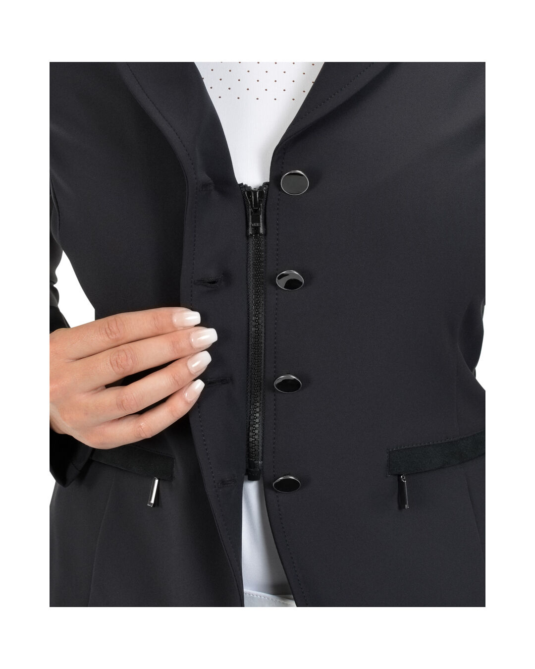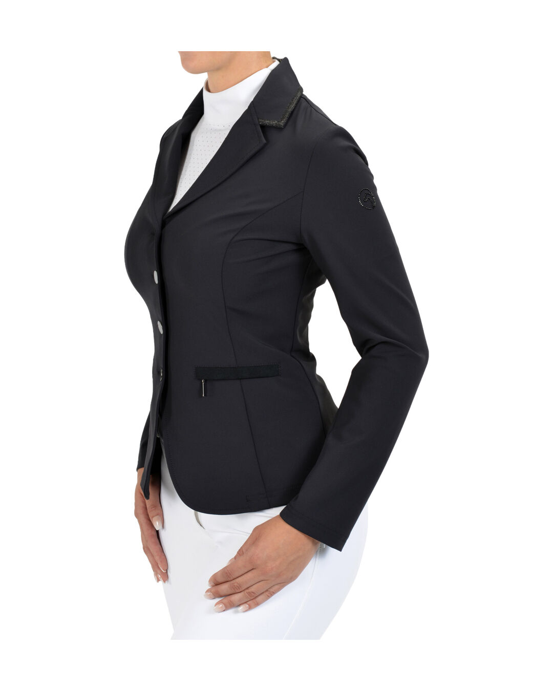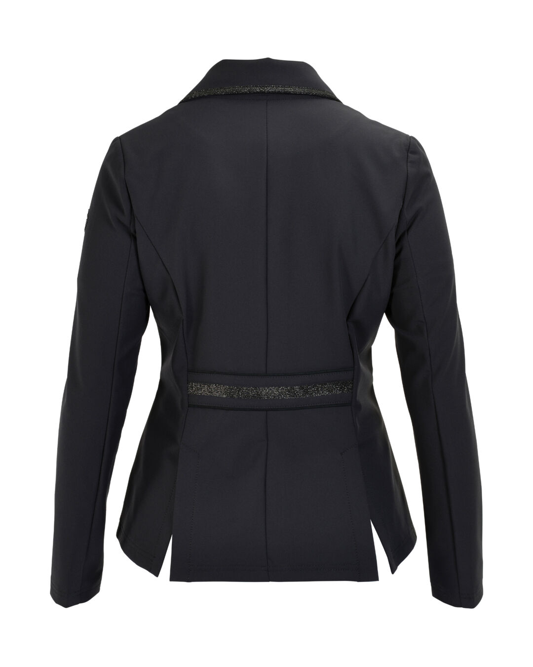 Dieses elegante Turnierjacket zeichnet sich durch seine feinen Glitzerdetails an Kragen und Taille aus, die jedem Outfit einen Hauch von Glanz verleihen. Die Taschen sind geschmackvoll mit einem Wildlederband abgesetzt, während die Knöpfe in einem schlichten Design gehalten sind, um den edlen Look abzurunden.