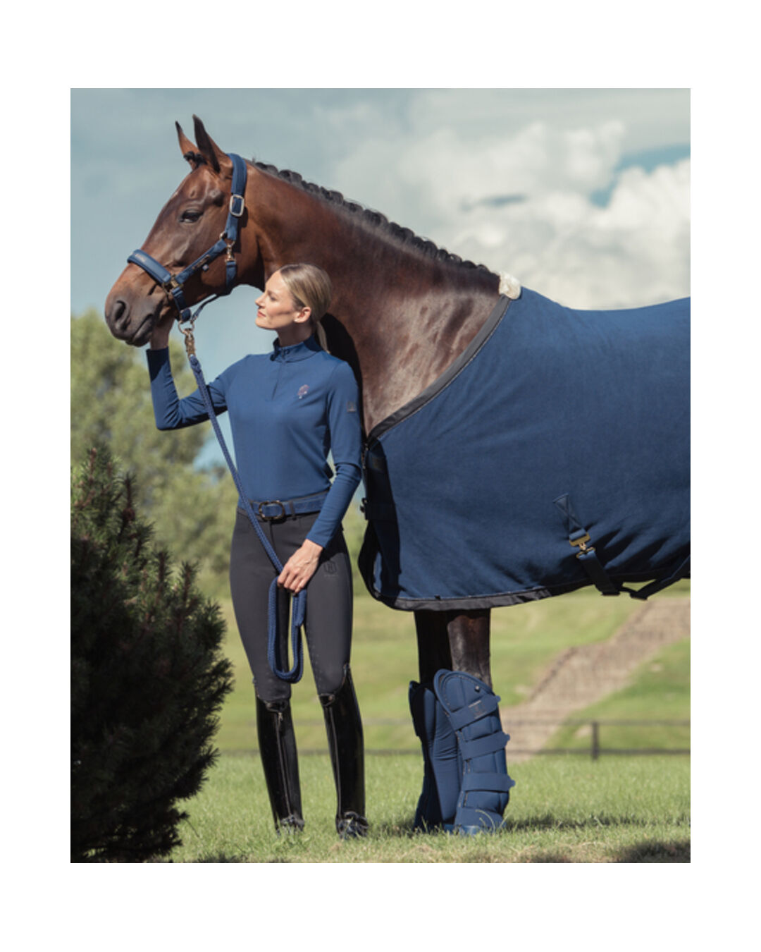 Diese Decke besticht durch ihre hochwertige Anti-Pilling Fleece Qualität, die dein Pferd warm und trocken hält, während sie gleichzeitig langlebig und pflegeleicht bleibt. Ein Kunstfell-Widerristpolster schützt dein Pferd vor Scheuerstellen und sorgt für zusätzlichen Komfort. Die edle Lurex-Kordel auf der Glossy-Einfassung verleiht der Decke einen eleganten Touch, während der einseitige Heritage Lurex-Stick subtilen Luxus ausstrahlt.