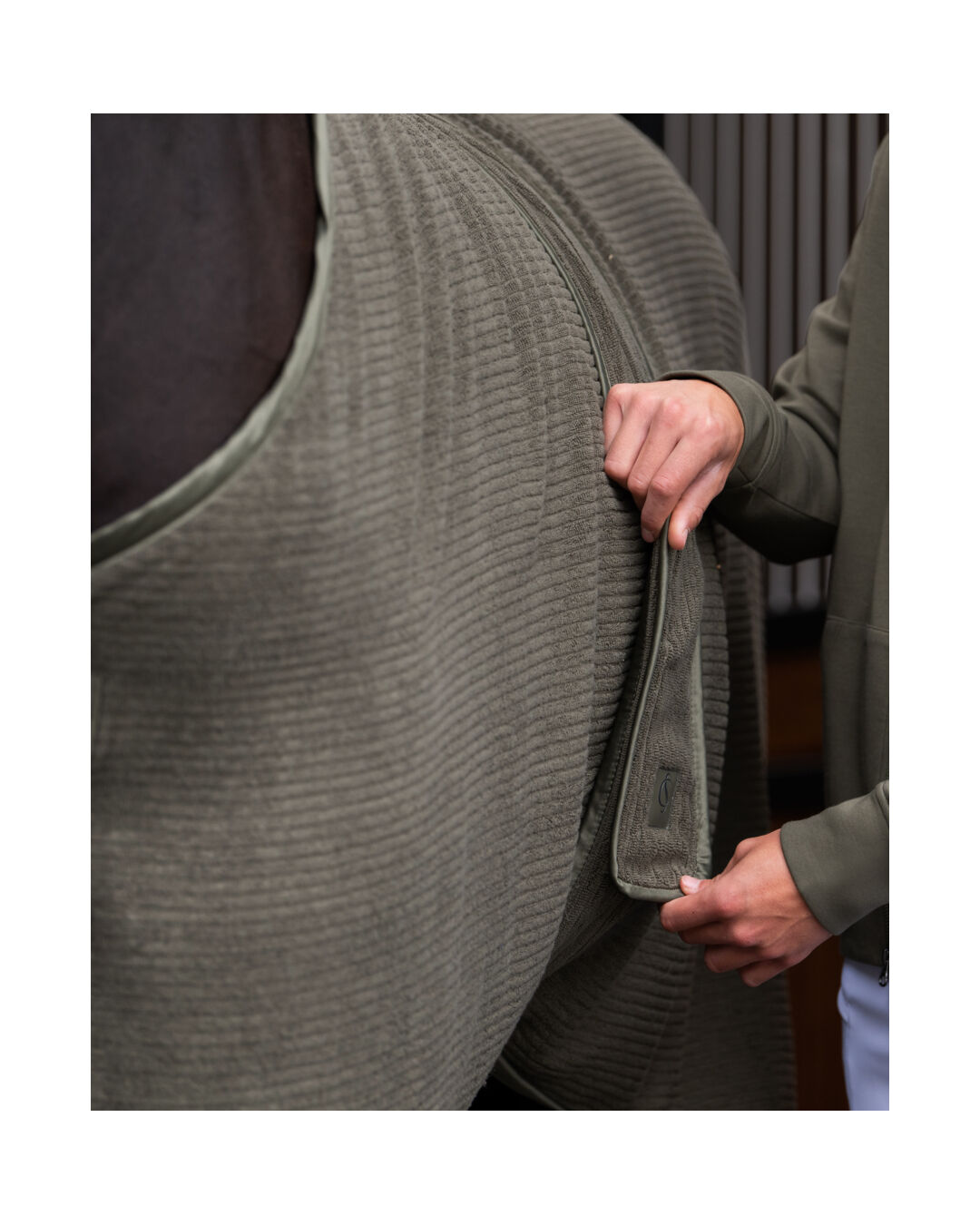 Das weiche Baumwoll-Frottee-Obermaterial ist besonders saugfähig und atmungsaktiv, sodass Feuchtigkeit effektiv aufgenommen und vom Pferdekörper abgeleitet wird. Damit ist dein Pferd nach dem Training oder nach dem Waschen schnell wieder trocken und vor Zugluft geschützt.