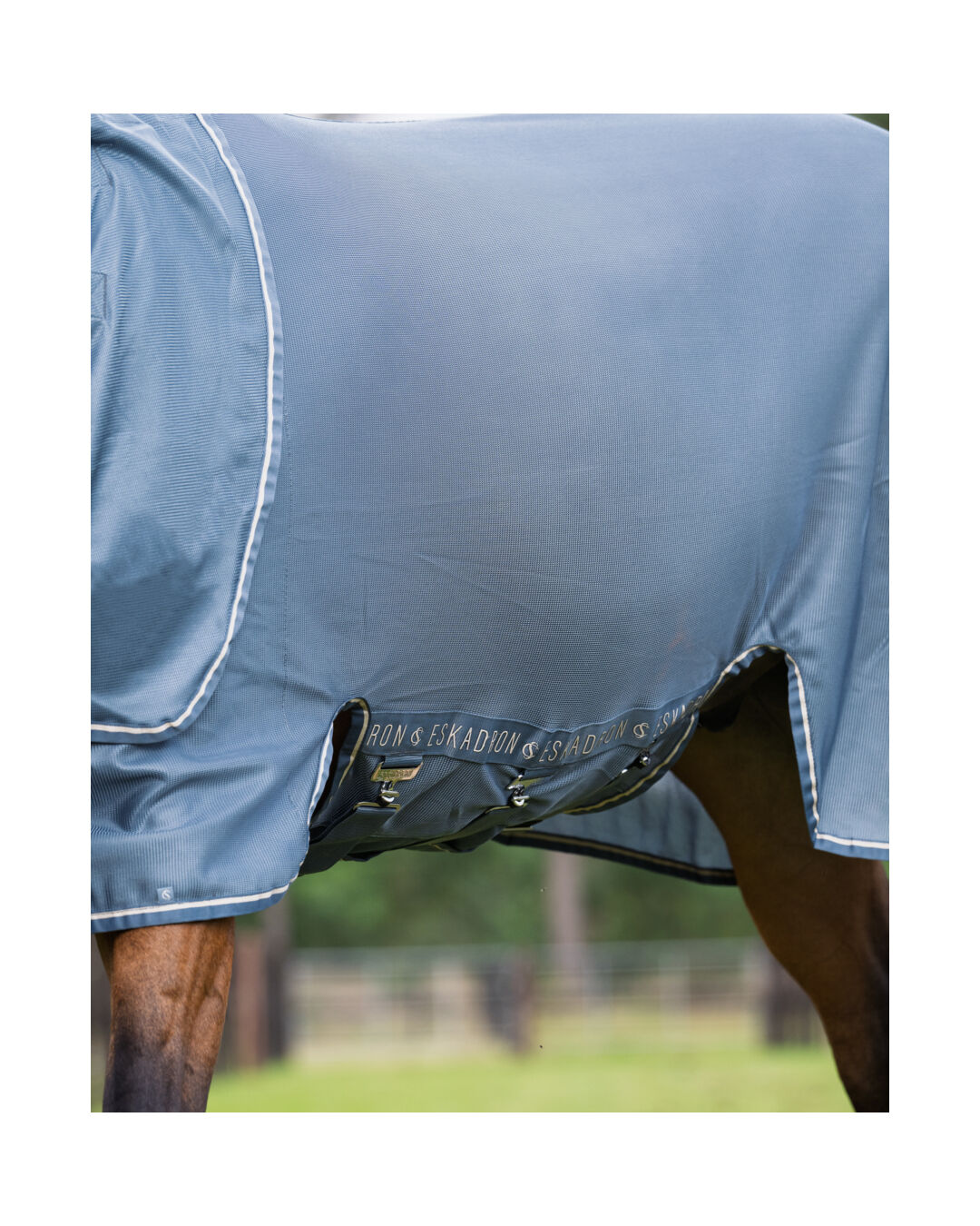 Optisch überzeugt die Decke mit ihrem Einfassband mit Kontrast-Streifen sowie den Eskadron Schriftzügen an Hals und Bauch, die den hochwertigen Look unterstreichen. Eine zusätzliche Halfterfixierung sorgt dafür, dass das Halsteil sicher an Ort und Stelle bleibt, und der integrierte Schweiflatz bietet weiteren Schutz vor Insekten.