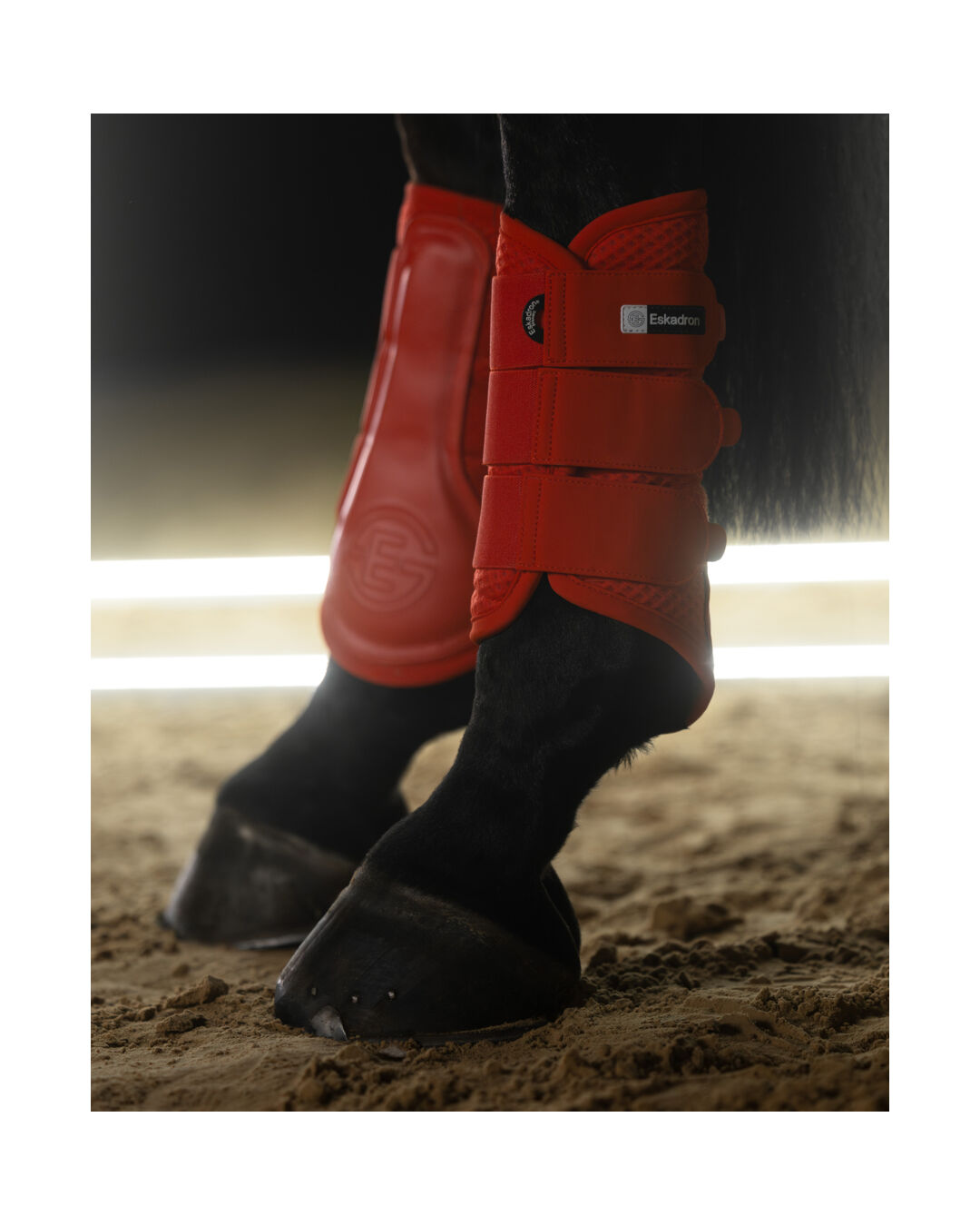 Das Multilayer-Mesh sorgt für optimale Luftzirkulation am Pferdebein, auch bei wärmeren Temperaturen oder intensiver Belastung. Die robuste PU-Streichschutzzone mit geprägtem Eskadron-Logo schützt zuverlässig vor Stößen und Streifverletzungen.